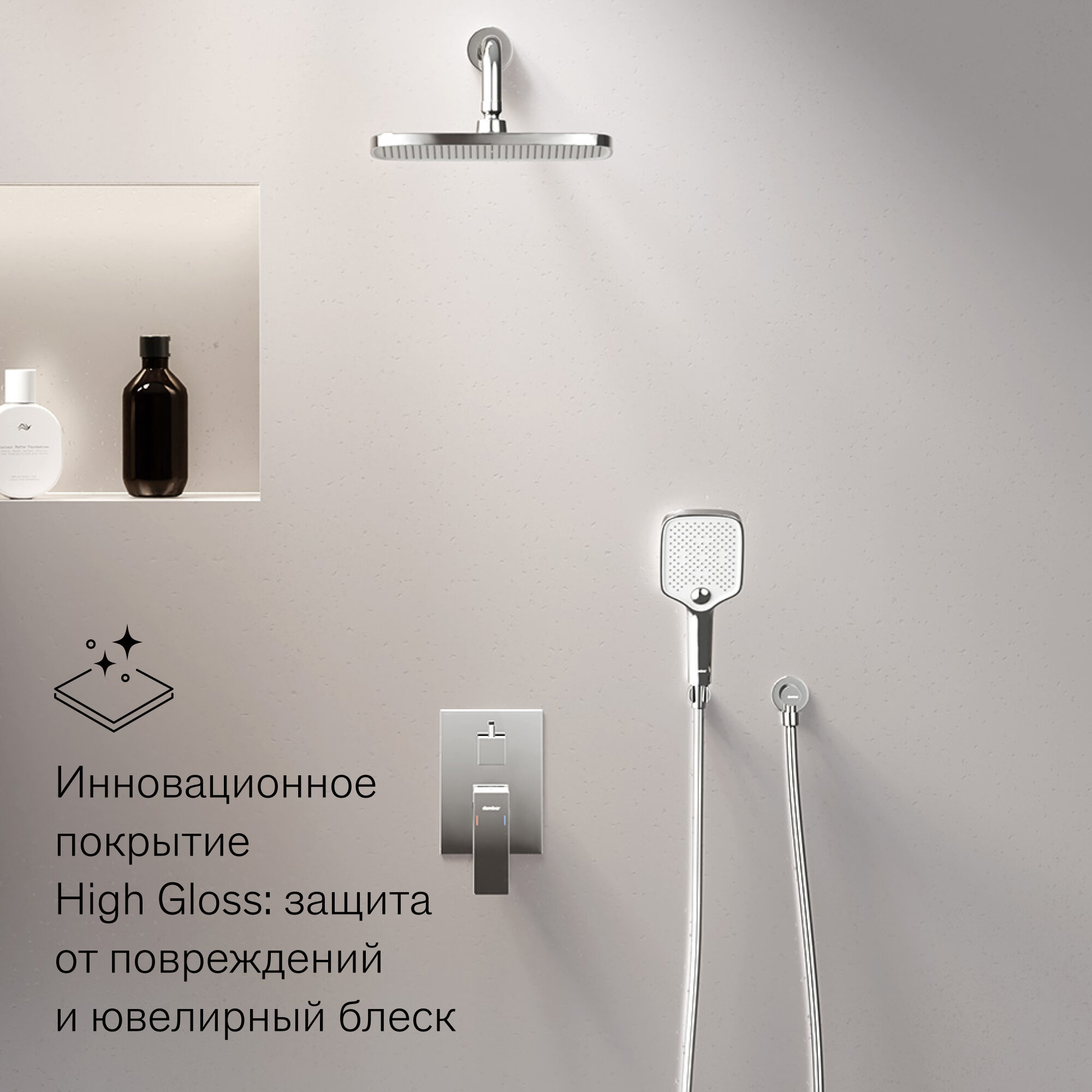 Gala — это современная душевая система с мягкими геометричными формами, которая идеально впишется в интерьер в стиле минимализм, лофт или скандинавский. Благодаря полностью встраиваемой установке, она помогает создать ощущение простора и чистоты.