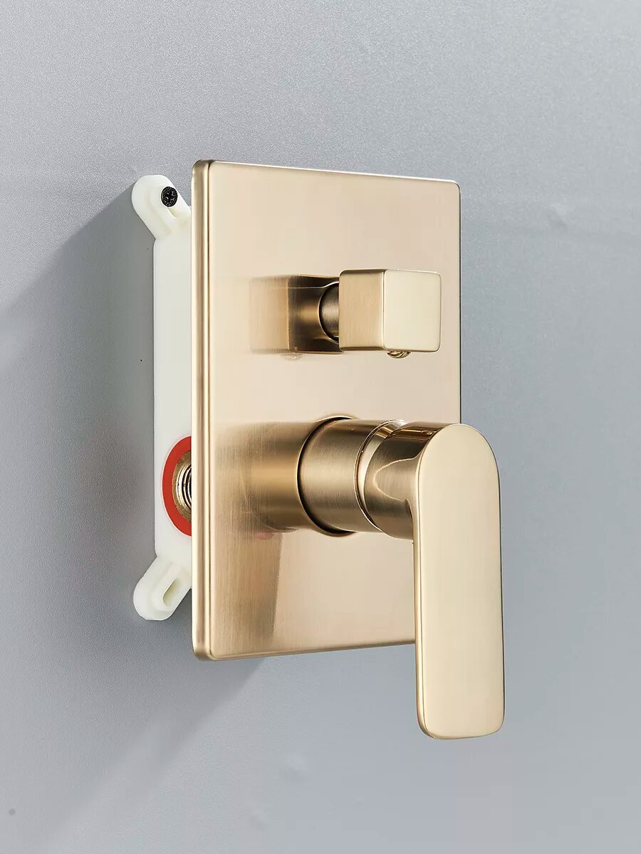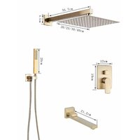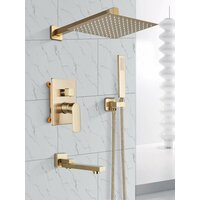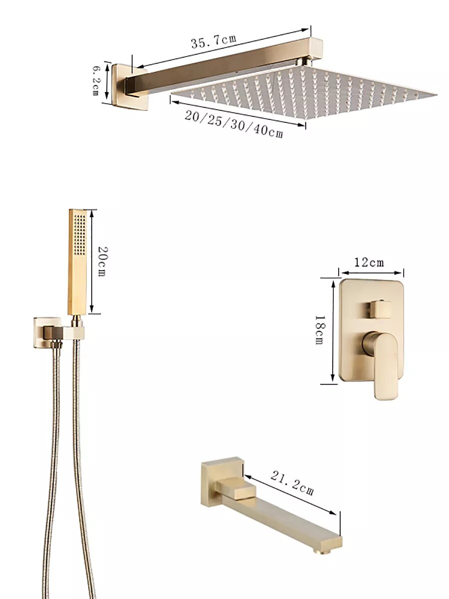 Душевая система скрытого монтажа цвета матовое золото – это стильное и современное решение для ванной комнаты. Она имеет минималистичный дизайн, что позволяет ей гармонично вписываться в интерьер ванной комнаты, душевого уголка или душевой кабины и создавать чистые линии без видимых труб и креплений. Это делает её не только эстетически привлекательной, но и удобной в использовании. Встраиваемая душевая система включает в себя лейку тропического душа, ручную лейку, поворотный излив, смеситель, переключатель режимов и регулятор напора и температуры воды, шланг. Лейка тропического душа крепится к стене, имеет шарнирный поворотный механизм и устанавливается в положение, комфортное для принятия душа. Использование данной системы с тропическим душем приносит эстетическое удовольствие и приятный расслабляющий эффект.