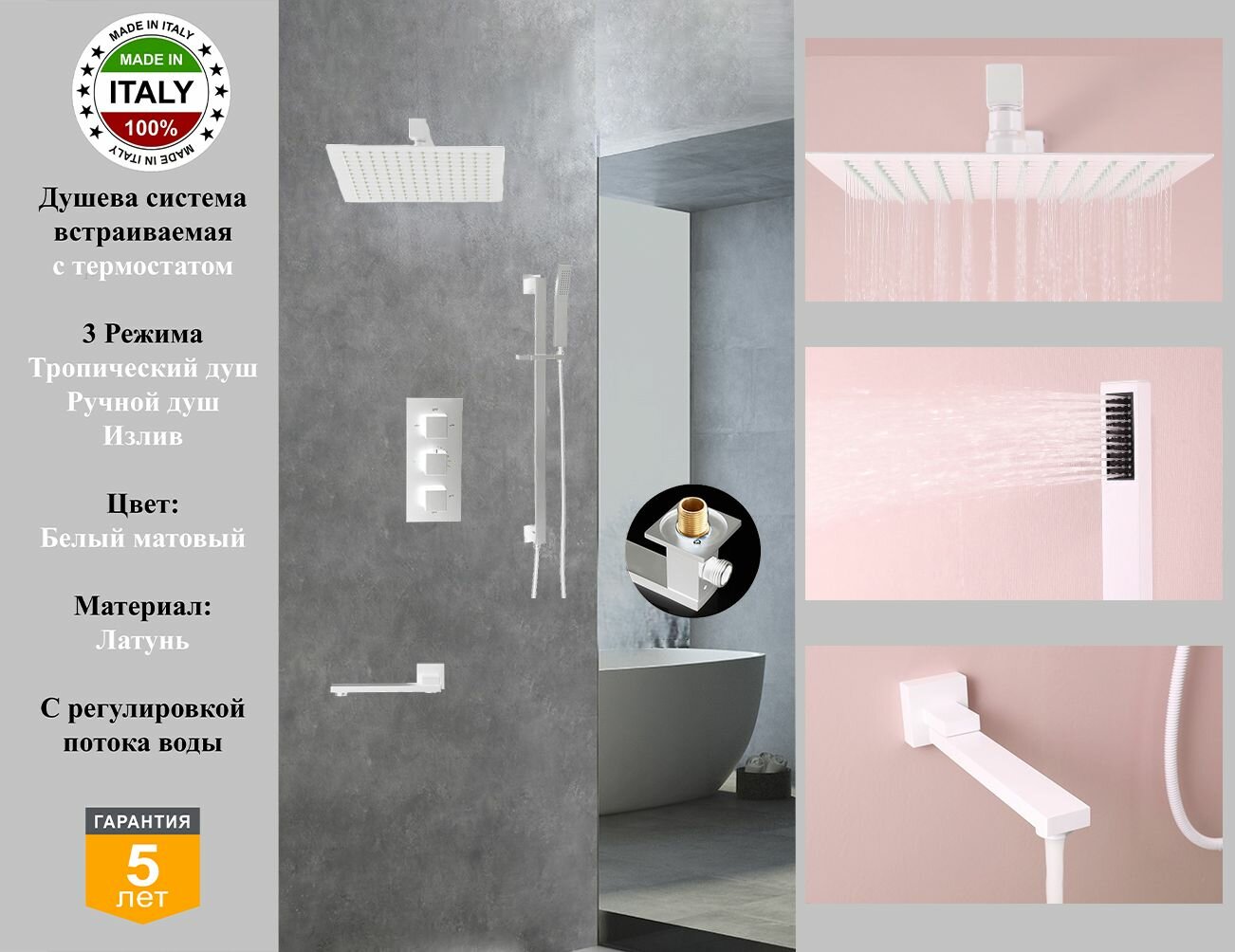 Купить Душевая система скрытого монтажа c термостатом Gristo White Matt Termo GWMT-4062-1 белый матовый с доставкой по всей России.