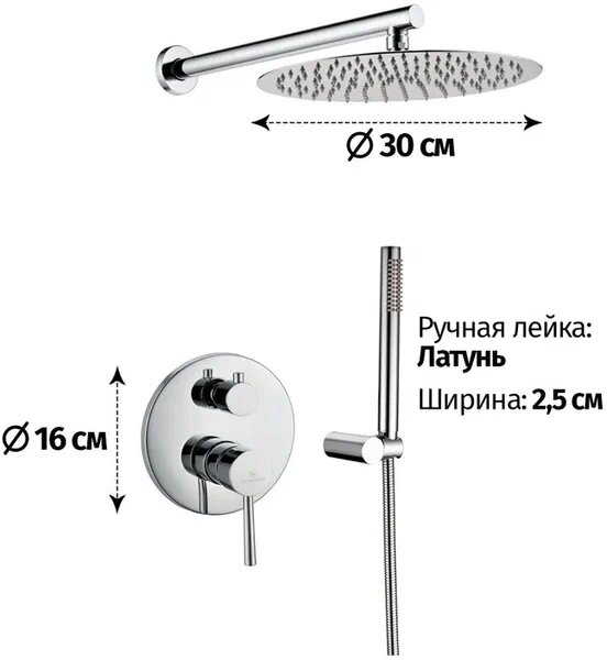 | Комплектация | вентиль, верхний душ, держатель лейки, дивертор, излив для набора воды, кронштейн для верхнего душа, лейка, набор эксцентриков, отражатель, переключатель потоков, прокладки, ручной душ, смеситель, шланг |