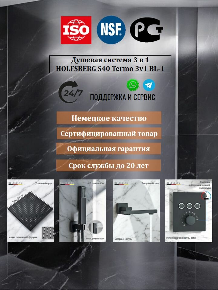 Погрузитесь в мир релакса и комфорта с встраиваемой душевой системой HOLFSBERG. Эта элегантная система, выполненная в стильном матовом черном цвете, станет настоящим украшением вашей ванной комнаты. Наслаждайтесь идеальной температурой воды благодаря встроенному термостату, который мгновенно реагирует на изменения давления и обеспечивает стабильный поток. Кнопки переключения режимов вместе с терморегулятором позволяют создают удобство и комфорт при пользовании душевой системой.