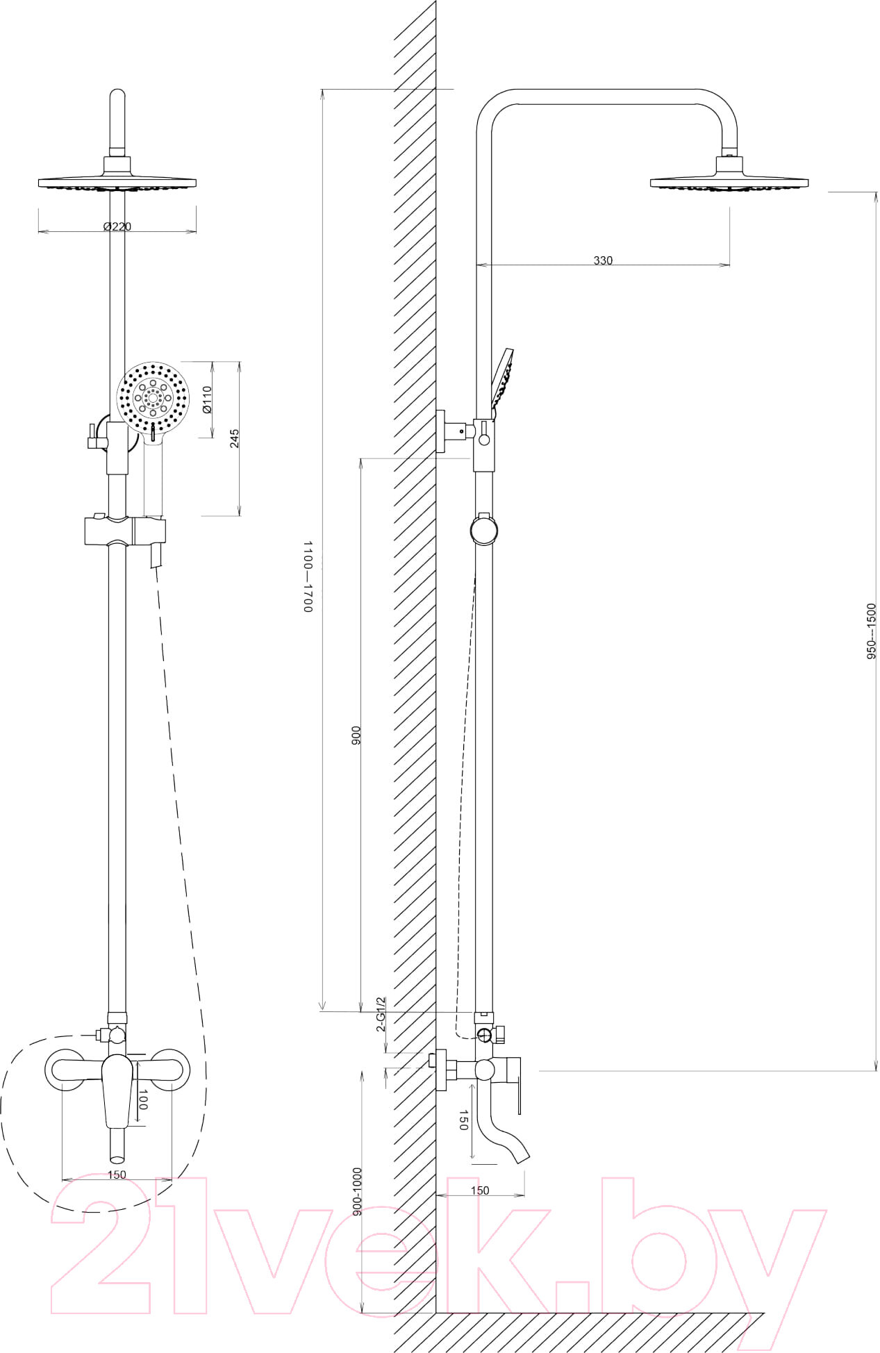 Душевая система VODA Hill VST3300-1 монтируется на стену с помощью стандартн