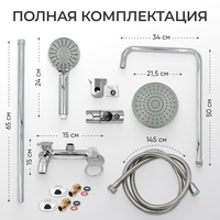 | Комплектация | верхний душ, держатель лейки, дивертор, душевая стойка, излив для набора воды, кронштейн для верхнего душа, лейка, набор эксцентриков, отражатель, переключатель потоков, ручной душ, смеситель, шланг |