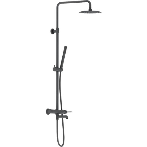 Цвет: черный, Поверхность: матовая, Стилистика дизайна: современный стиль, Материал: латунь, пластик, Смеситель: однорычажный, Механизм: керамический картридж, Расположение рычага: сбоку, Диаметр лейки, см: 5.4, Высота штанги, см: 145, Длина шланга, см: 175, Материал шланга: пластиковый, Диаметр верхнего душа, см: 25, Вылет верхнего душа, см: 44.5, Количество режимов струи: 1, Ручной душ: есть, Тропический (верхний) душ: есть, Излив для наполнения ванн: есть, Длина излива, см: 19.4, Форма излива: традиционная, Линии форм: баланс, Исполнение шланга: пластиковый, Система против известковых отложений: есть, Стандарт подводки: 2", Девиатор: нет, Подсветка: нет, Защита от обратного потока: есть, Защита от перекручивания: есть, Ограничение температуры: есть, Функция экономии расхода: нет, Ширина, см: 27.8, Высота, см: 145, Глубина, см: 57, Оснащение: душевая лейка, аэратор, эксцентрики, переключатель потоков, держатель для душа, душевой шланг, Дополнительные функции: излив для наполнения ванны, ручной душ