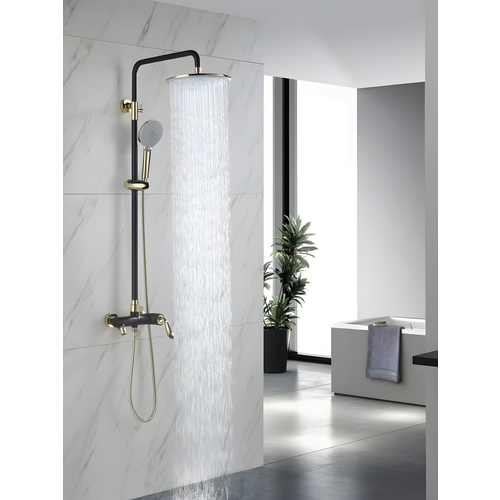 Душевая стойка La’Casa выполнена в черном цвете с глянцевым золотым покрытием, что придает ей современный и стильный вид. Поверхность стойки глянцевая, что делает ее еще более привлекательной. Материал изготовления – латунь, которая обеспечивает прочность и долговечность изделия.