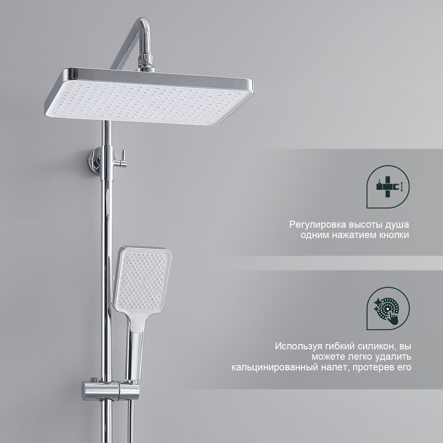 верхний душ, держатель лейки, душевая стойка, душевая штанга, излив для набора воды, кронштейн для верхнего душа, лейка, набор эксцентриков, настенный держатель, отражатель, переключатель потоков, прокладки, ручной душ, смеситель, шланг