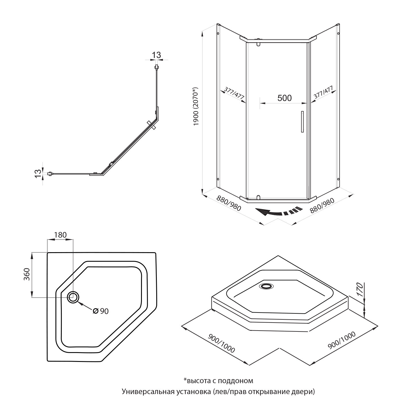 Душевое Ограждение Дека-Хром, 90х90, пятиугольный, поддон (3 места+сифон D90мм): сравнение цен, характеристики, фото, актуальное наличие и цены.