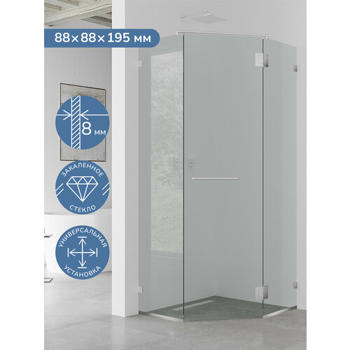 С оптимальными размерами 88х88х195 см, этот душевой уголок подходит для большинства ванных комнат, позволяя эффективно использовать пространство, не жертвуя комфортом. Универсальная установка угла делает его подходящим для различных планировок.