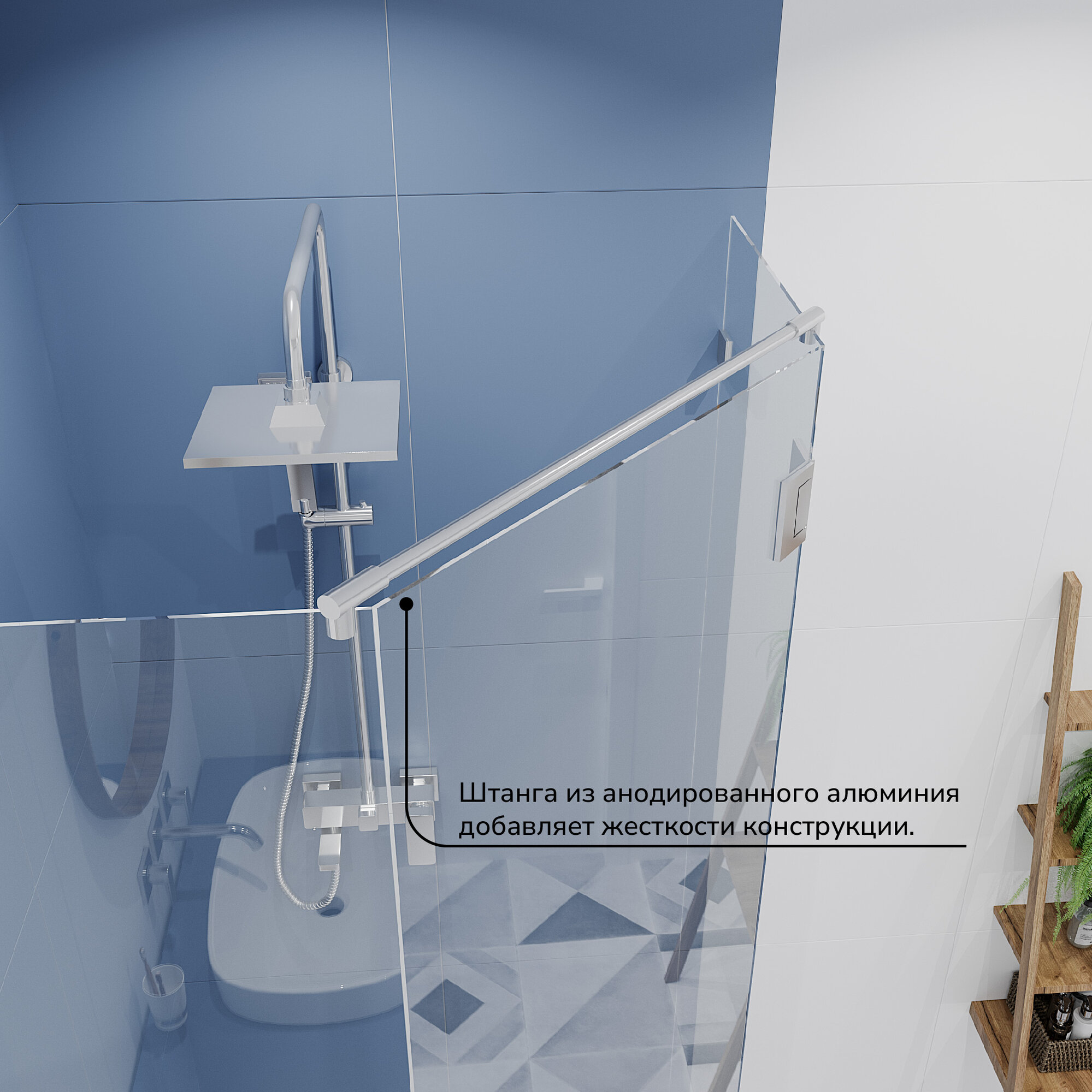 С оптимальными размерами 97х97х195 см, этот душевой уголок подходит для большинства ванных комнат, позволяя эффективно использовать пространство, не жертвуя комфортом. Универсальная установка угла делает его подходящим для различных планировок.
