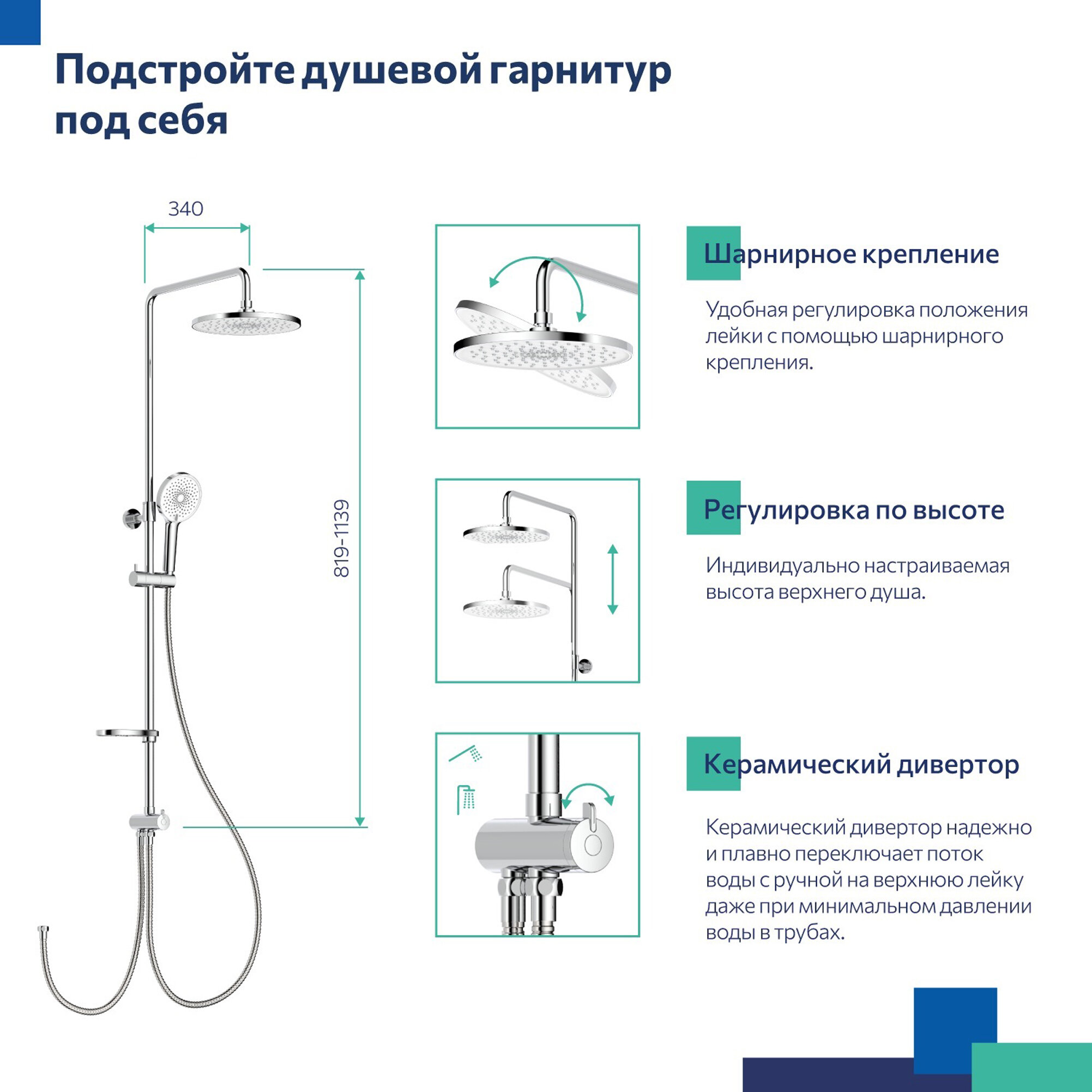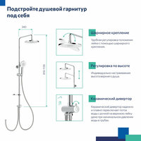 • Дивертор плавно переключает поток воды между душевыми аксессуарами: верхняя и ручная (3 режима) лейки идут в комплекте.