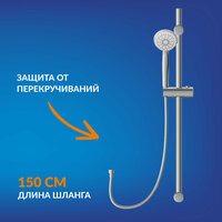 Длина шланга составляет 150 см, что позволяет использовать душ на расстоянии от стены. В комплекте также есть держатель для душевой лейки и смеситель.