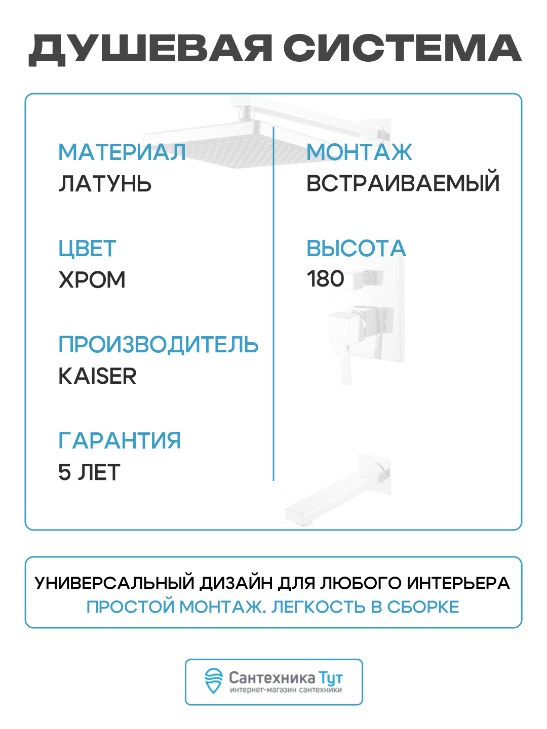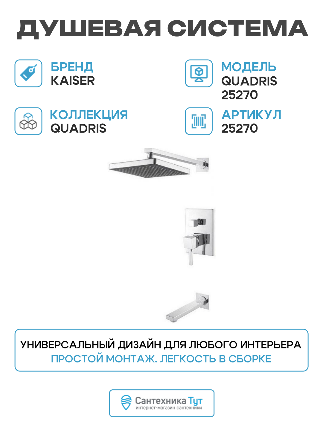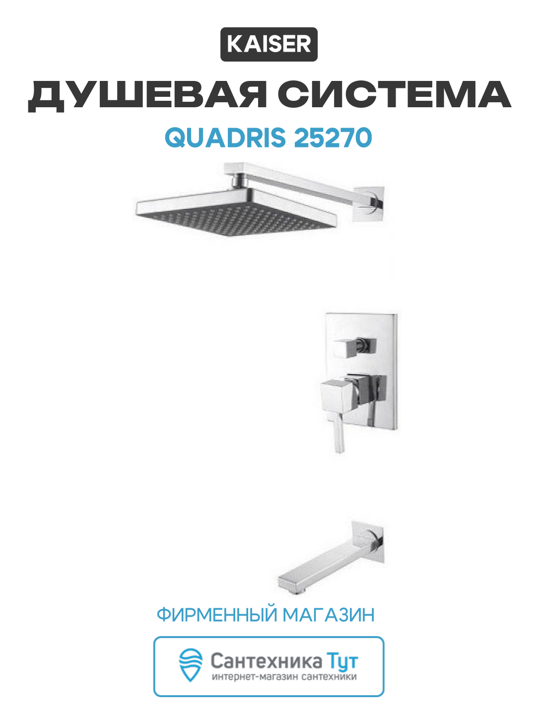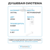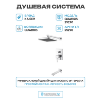 Душевой комплект Kaiser Quadris 25270 3 в 1, встраиваемый, с внутренней частью в комплекте, со смесителем, с изливом, с верхним душем, латунный, хром, глянцевый