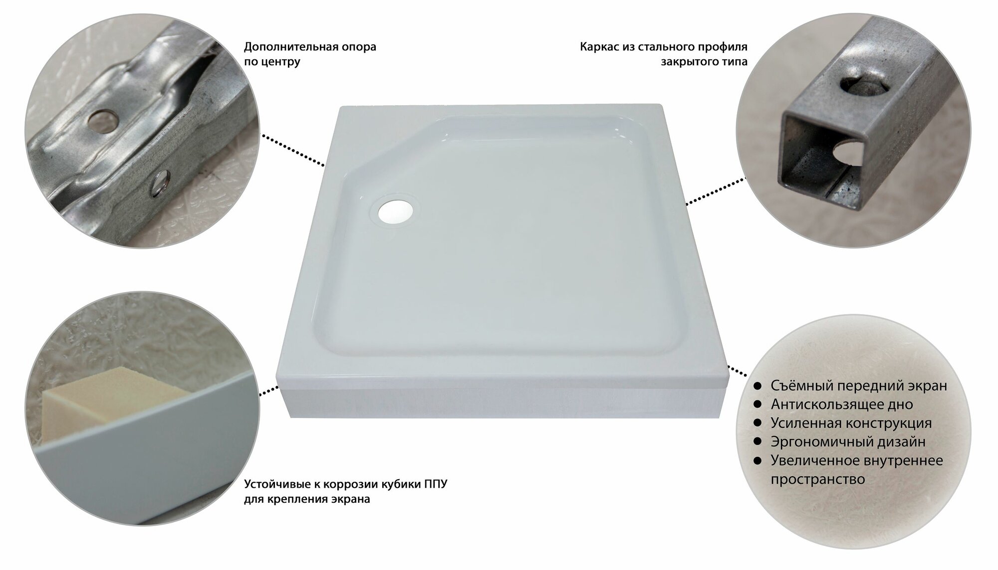 Квадратный душевой поддон тм ARAGUT 100х100 по всей площади дна имеется закладной элемент толщиной 16мм, что обеспечивает надежность и устойчивость конструкции, устанавливается на стальной оцинкованный каркас из П-образного открытого профиля, исключающий задерживания влаги и появление коррозии. Прост в установке, надежен в эксплуатации, неприхотлив в уходе. Высота поддона от пола до верхнего борта поддона 17см, глубина поддона в районе слива 6,5см. Поддон на каркасе выдерживает нагрузку 500кг. Поставляется поддон в комплекте с каркасом и съемным экраном. Диаметр сливного отверстия 90 мм. Сифон приобретается отдельно (Артикул Маркета 4370577637).