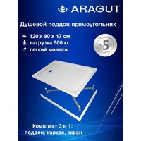 Прямоугольный душевой поддон тм ARAGUT 120х80 по всей площади дна имеется закладной элемент толщиной 16мм, что обеспечивает надежность и устойчивость конструкции, устанавливается на стальной оцинкованный каркас из П-образного открытого профиля, исключающий задерживания влаги и появление коррозии. Прост в установке, надежен в эксплуатации, неприхотлив в уходе. Высота поддона от пола до верхнего борта поддона 17см, глубина поддона в районе слива 6,5см. Поддон на каркасе выдерживает нагрузку 500кг. Поставляется поддон в комплекте с каркасом и съемным экраном. Диаметр сливного отверстия 90 мм. Сифон приобретается отдельно (Артикул Маркета 4370577637).