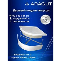 Полукруглый душевой поддон тм ARAGUT 90х90 по всей площади дна имеется закладной элемент толщиной 16мм, что обеспечивает надежность и устойчивость конструкции, устанавливается на стальной оцинкованный каркас из П-образного открытого профиля, исключающий задерживания влаги и появление коррозии. Прост в установке, надежен в эксплуатации, неприхотлив в уходе. Высота поддона от пола до верхнего борта поддона 31см, глубина поддона в районе слива 20см. Поддон на каркасе выдерживает нагрузку 500кг. Поставляется поддон в комплекте с каркасом и съемным экраном. Диаметр сливного отверстия 50мм. Сифон приобретается отдельно (Артикул Маркета 4370571009)