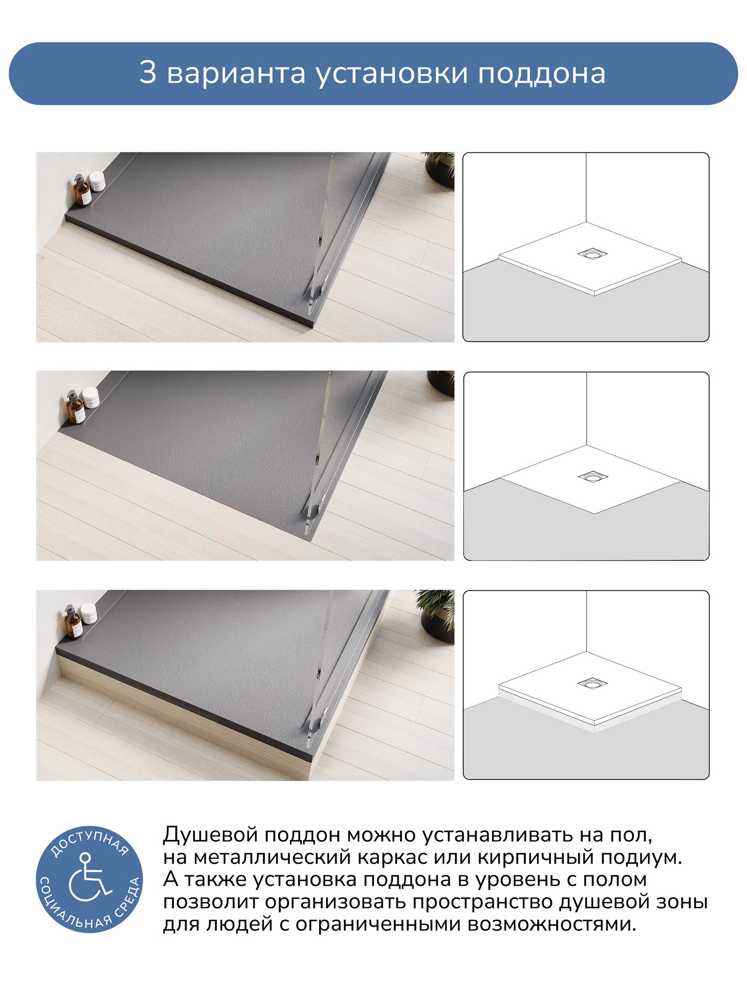 Поддон произведен из экологически чистых материалов, устойчив к воздействию химических веществ и механических повреждений, обладает высокой теплопроводимостью и прочностью. Антискользящая поверхность душевого поддона делает его использование безопасным. Являются практически бесшумными в сравнении с душевыми поддонами из стали или акрила и т. д, за счет используемых при производстве материалов и конструктивных особенностей (толщины стенок).
