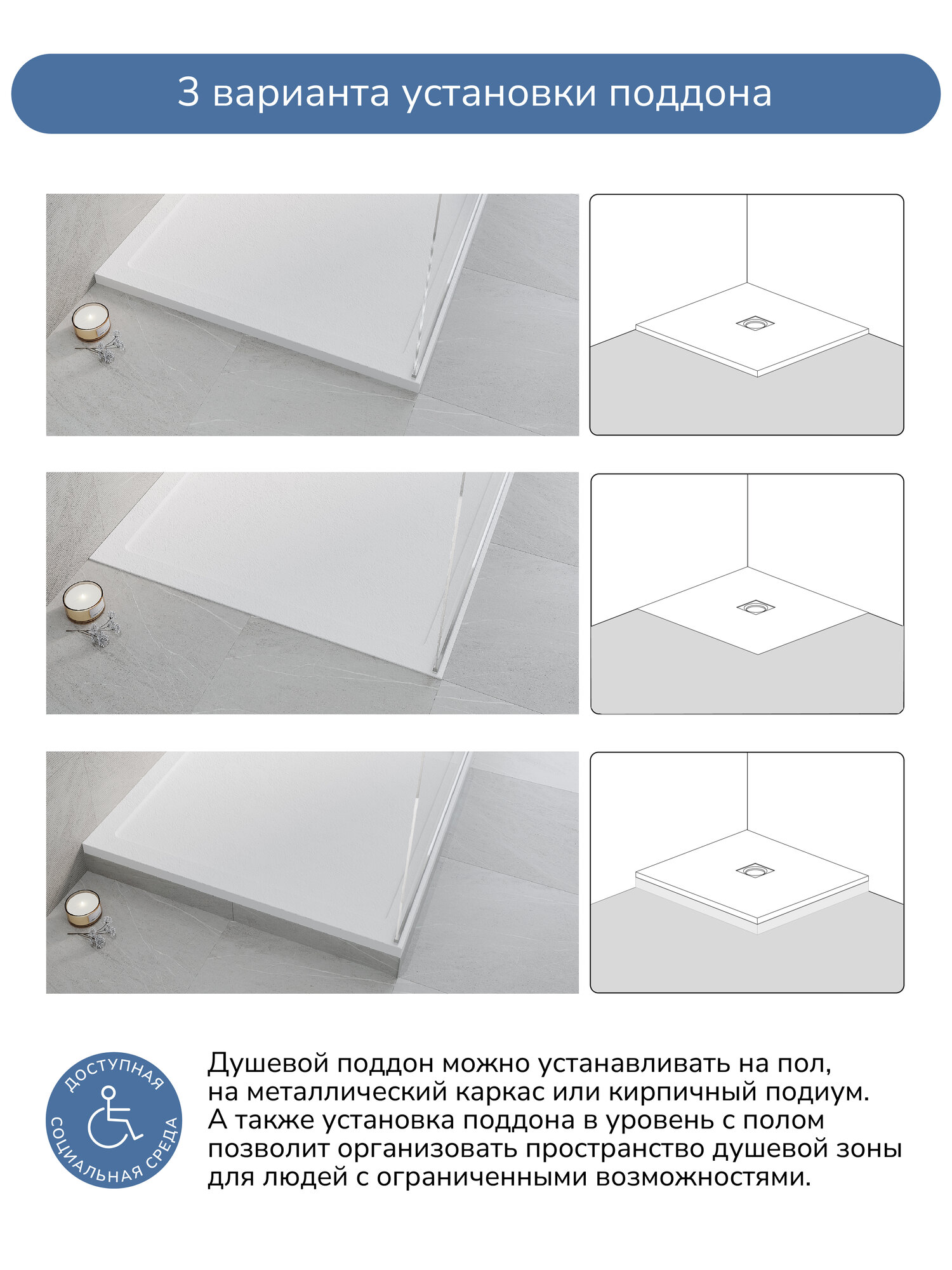 Поддон произведен из экологически чистых материалов, устойчив к воздействию химических веществ и механических повреждений, обладает высокой теплопроводимостью и прочностью. Антискользящая поверхность душевого поддона делает его использование безопасным. Являются практически бесшумными в сравнении с душевыми поддонами из стали или акрила и т. д, за счет используемых при производстве материалов и конструктивных особенностей (толщины стенок).