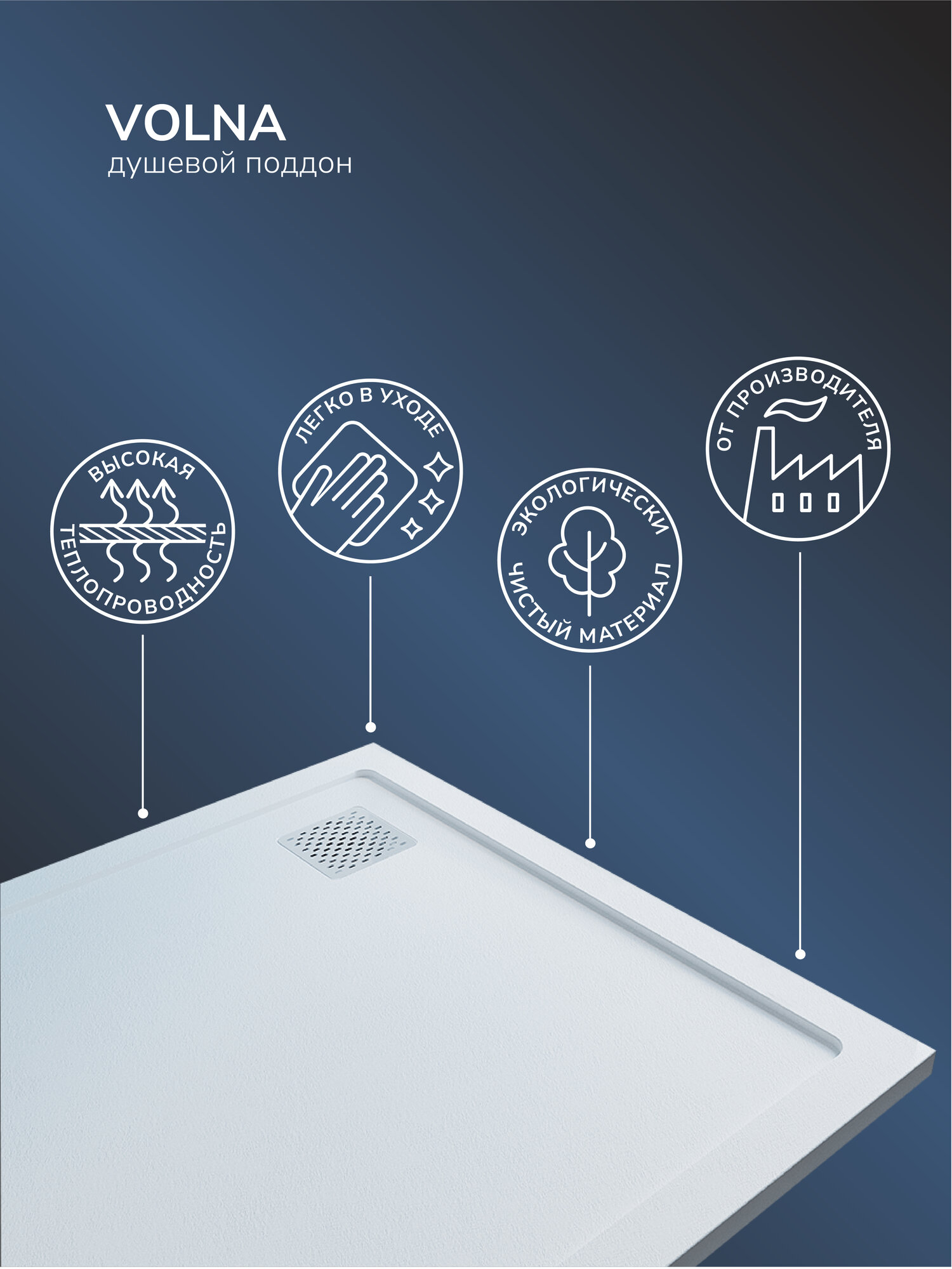 Душевой поддон коллекции Volna из литьевого мрамора сочетает в себе элегантность и комфорт, адаптируется к любому пространству ванной комнаты и дизайну, за счет своей текстуры и цвета, делая ванные комнаты более просторными и минималистичными.