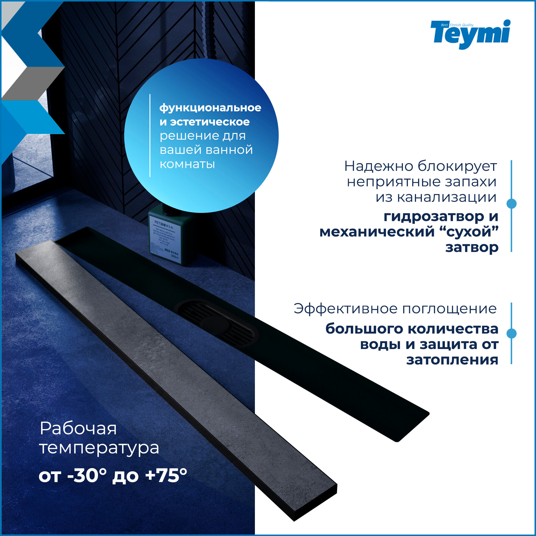 Купить Трап для душа под плитку с комбинированным гидрозатвором Teymi Aina Prime черный 60 см T90010 с доставкой по всей России.