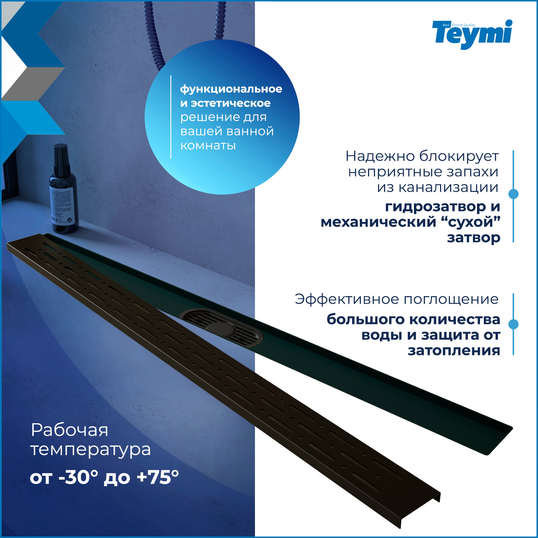 Купить Трап для душа с комбинированным гидрозатвором Teymi Helmi Prime черный 80 см решетка нержавеющая сталь T90341 с доставкой по всей России.