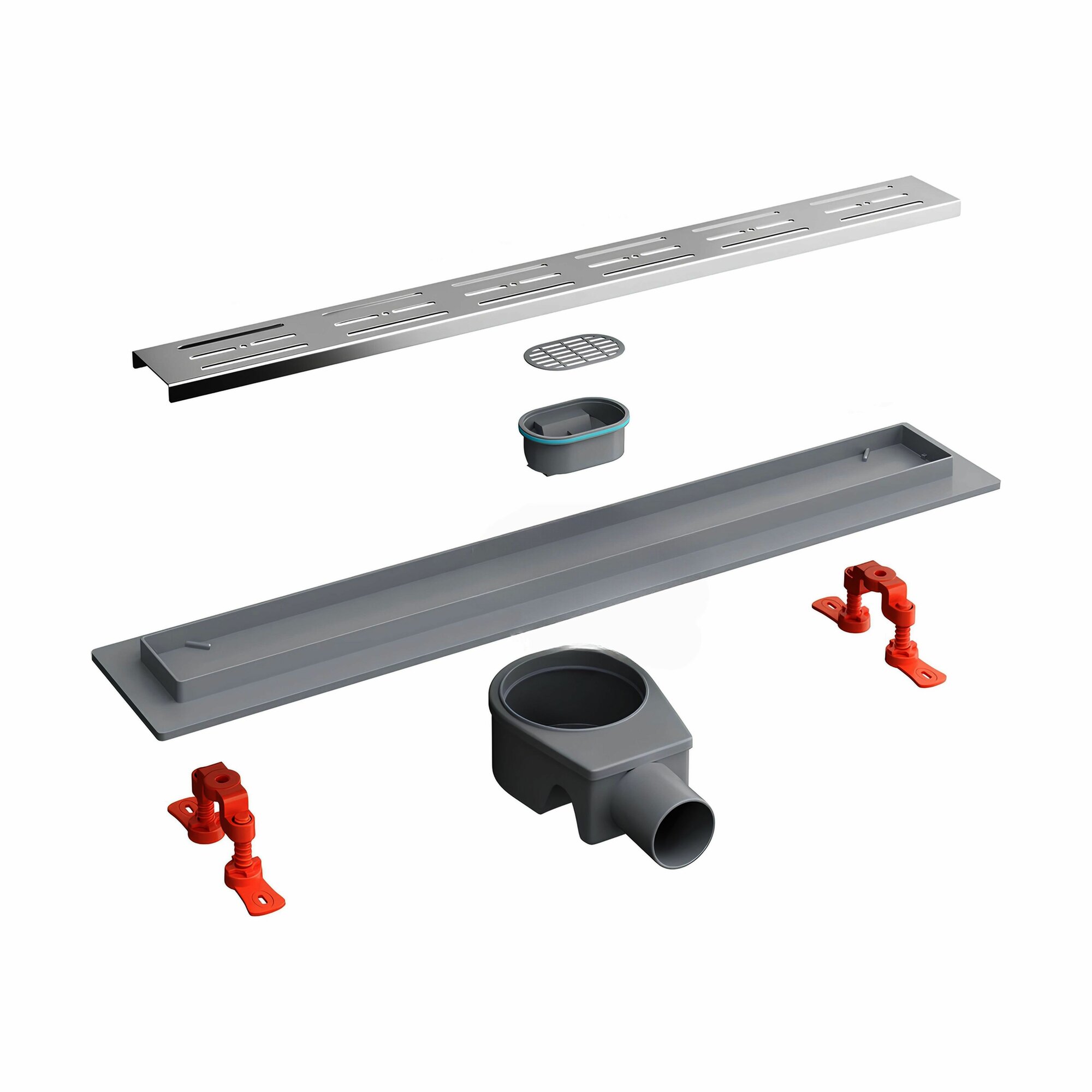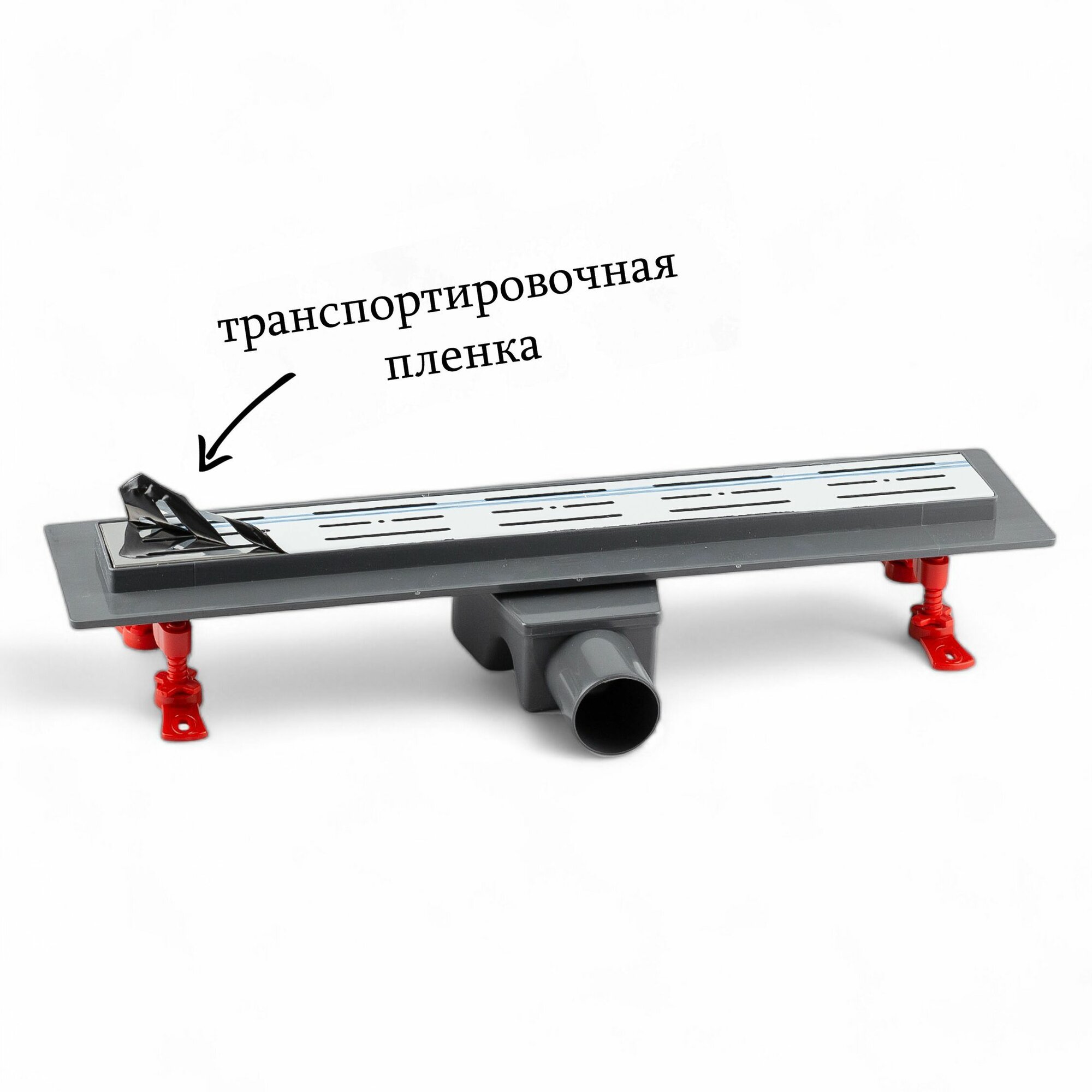 Душевой трап из ABS-пластика с решеткой из нержавеющей стали 304 марки, линейный, горизонтальный с комбинированным затвором (клапан+гидро), с регулируемыми ножками и бортиками под плитку шириной 30 мм по длине и 25 мм по бокам - это специальный элемент сантехнических коммуникаций, предназначенный для отвода воды в систему канализации. Ножки регулируются по высоте от 50 мм до 65 мм. Выход душевого трапа имеет диаметр 50 мм и может вращаться на 360 градусов для соединения с трубой в любом месте. Рабочая поверхность трапа размером 600х60 мм. Кроме основной решетки слива на клапане установлен дополнительный фильтр. Для очистки можно снять как этот фильтр отдельно, так и весь клапан. Пропускная способность не менее 48 л/мин Габаритные размеры трапа указаны на схемах.