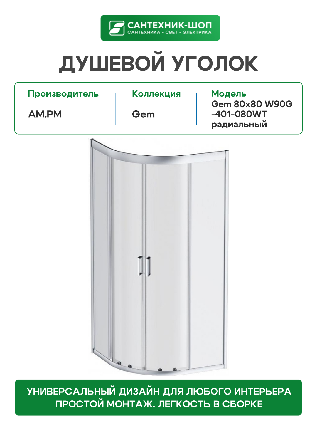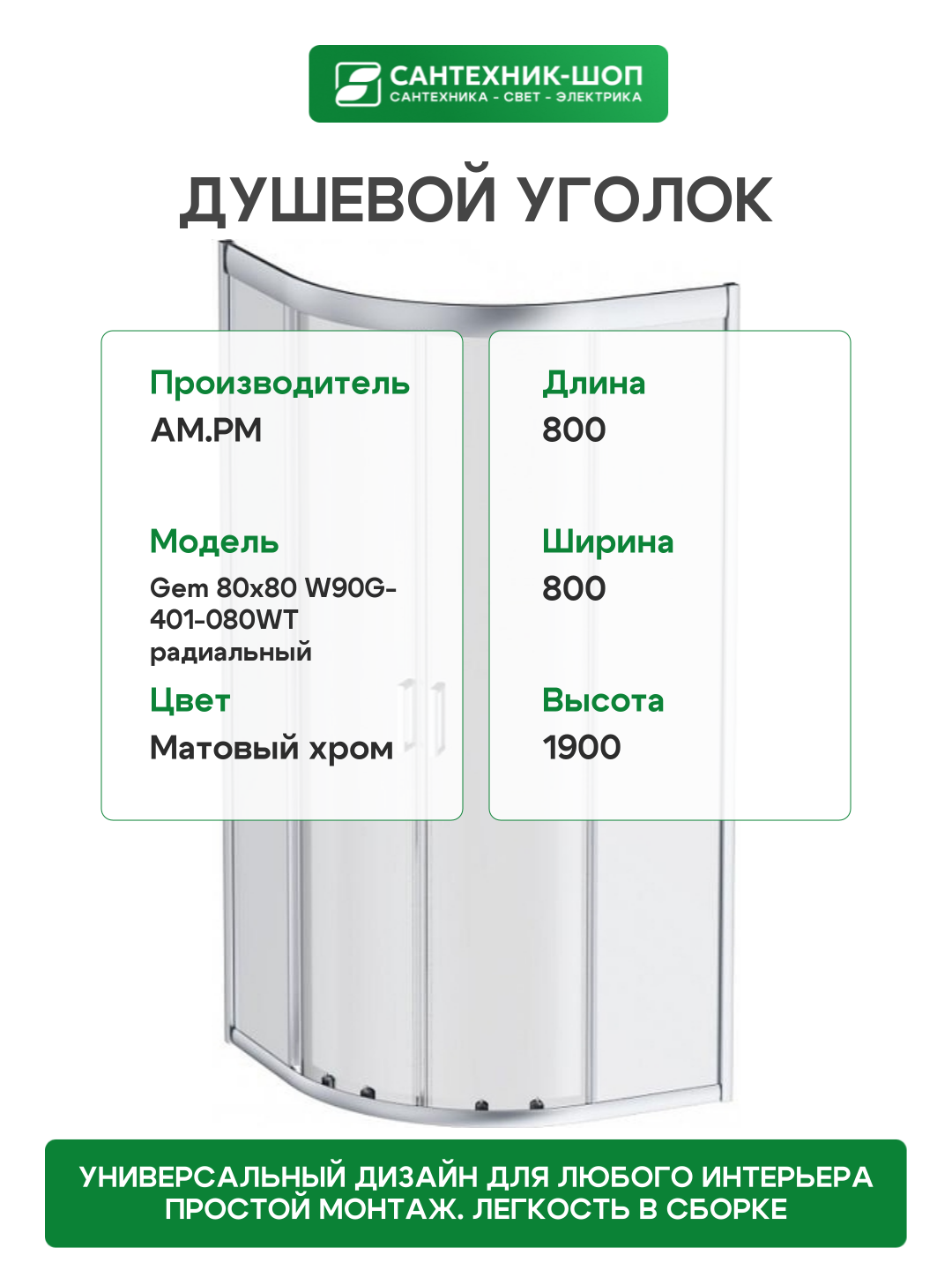 Купить Душевой уголок AM.PM Gem 80х80 W90G-401-080WT радиальный профиль Матовый хром стекло прозрачное с доставкой по всей России.