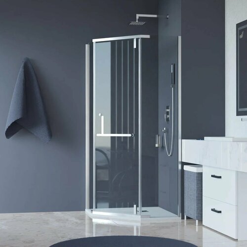 Форма: пятиугольная, Длина, см: 90, Ширина, см: 90, Высота, см: 195, Ширина входа, см: 52, Конструкция дверей: распашная, Двери открываются внутрь и наружу: нет, Исполнение полотна двери: прозрачное, Цвет профиля: хром, Поверхность профиля: глянцевая, Поддон в комплекте: нет, приобретается отдельно, Вид поддона: низкий, Ориентация: универсальная, Вид установки: напольный, на поддон, Количество секций двери: 1, Материал полотна двери: стекло, Толщина полотна двери, мм: 8, Стилистика дизайна: современный стиль, Материал поддона: акрил, Регулируемая ширина: да, Дополнительные функции: покрытие анти-капля, Дополнительная информация: регулируемая ширина: 89-89,5 см, Оснащение: полотенцедержатель