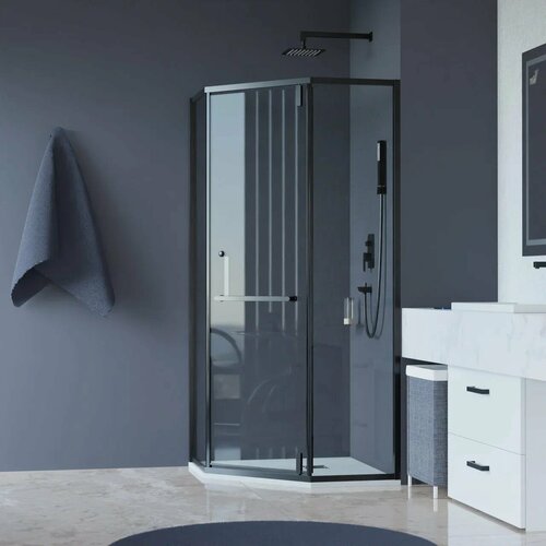 Форма: пятиугольная, Длина, см: 100, Ширина, см: 100, Высота, см: 195, Ширина входа, см: 52, Конструкция дверей: распашная, Двери открываются внутрь и наружу: нет, Исполнение полотна двери: прозрачное, Цвет профиля: черный, Поверхность профиля: матовая, Поддон в комплекте: нет, приобретается отдельно, Вид поддона: низкий, Ориентация: универсальная, Вид установки: напольный, на поддон, Количество секций двери: 1, Материал полотна двери: стекло, Толщина полотна двери, мм: 8, Материал профиля: нержавеющая сталь, Стилистика дизайна: современный стиль, Материал поддона: акрил, Регулируемая ширина: да, Дополнительные функции: покрытие анти-капля, Дополнительная информация: регулируемая ширина: 99-99,5 см, Оснащение: полотенцедержатель