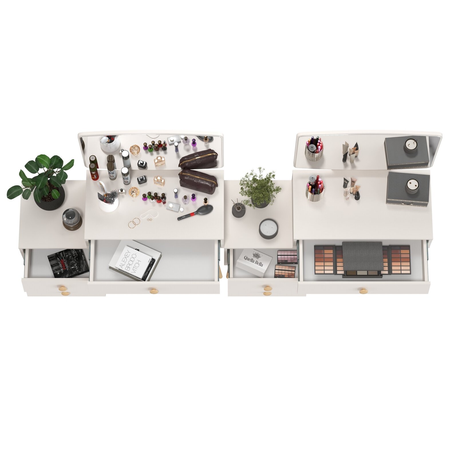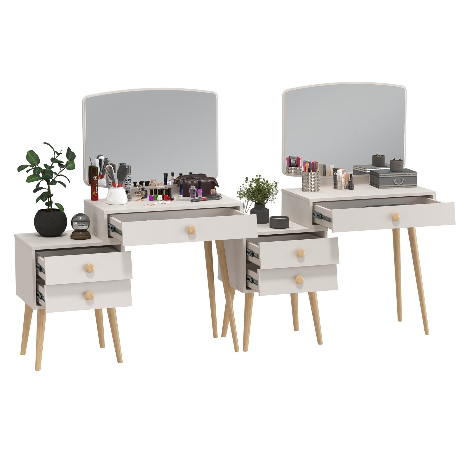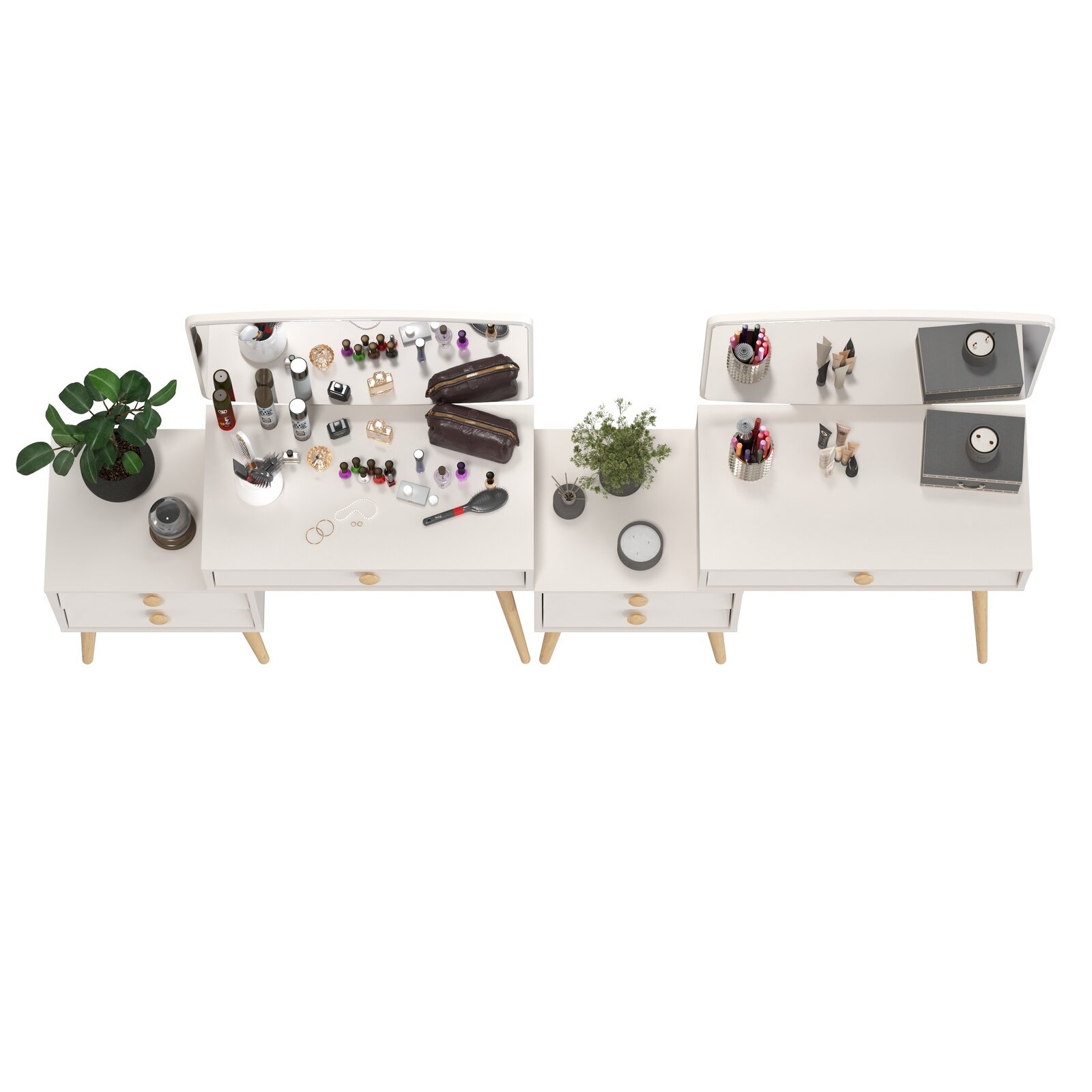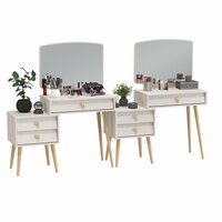 | Дополнительная информация | включает два трюмо; каждое трюмо объединяет функции туалетного столика и малой тумбы, оно оснащено тремя просторными выдвижными ящиками - один под столешницей столика и два в секции тумбы; ящики легко открываются благодаря шариковым направляющим; большое зеркало, расположенное над столешницей туалетного столика; деревянные ручки круглой формы; каждое трюмо установлено на опоры из массива бука; высота ножек у столика составляет 60 см, а у тумбы – 30 см; поставляется в разобранном виде |