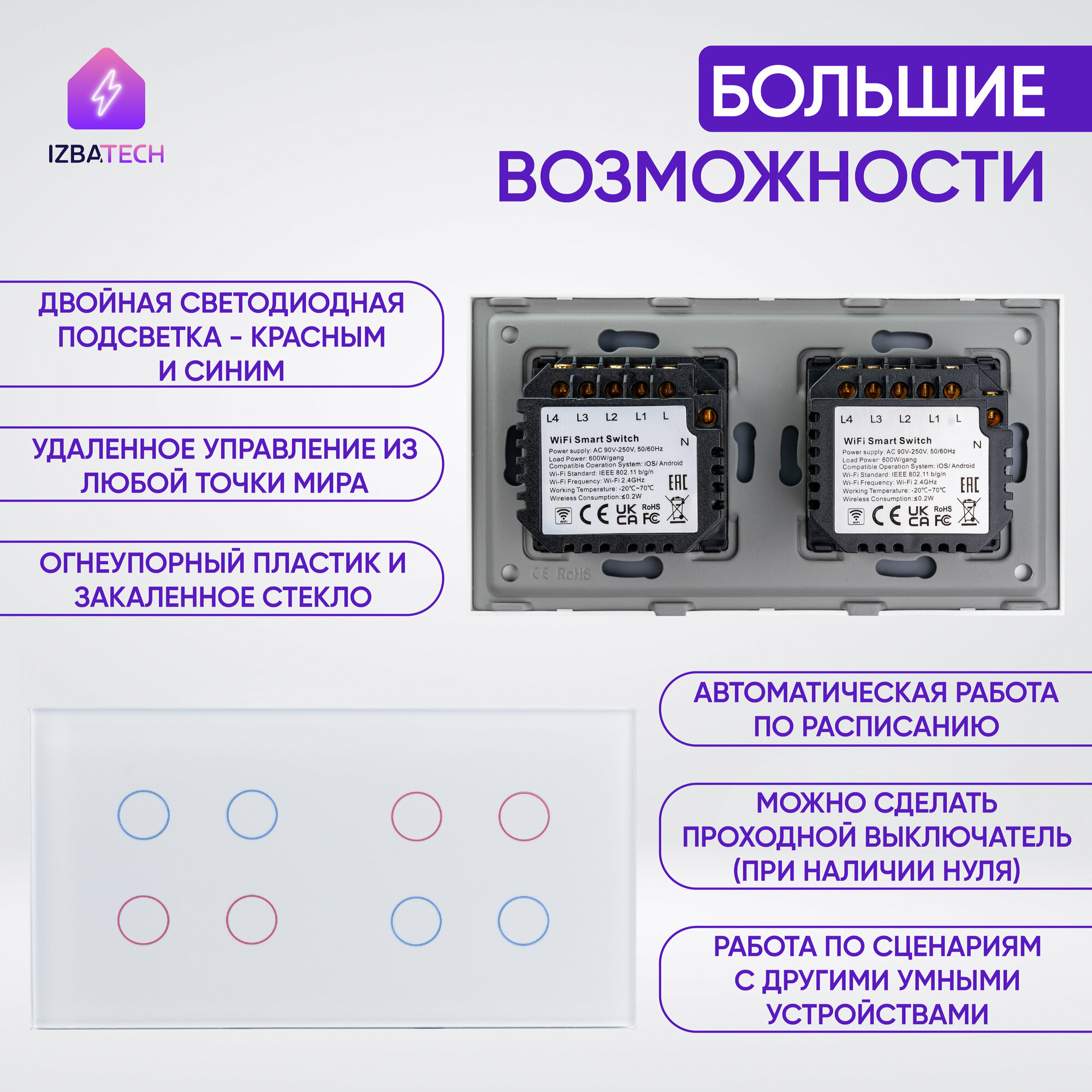 Умный сенсорный выключатель Wi-Fi на 2 поста (4 кл + 4 кл), с нулем и без нуля в одной рамке, белый, умный дом: сравнение цен, характеристики, фото, актуальное наличие и цены.