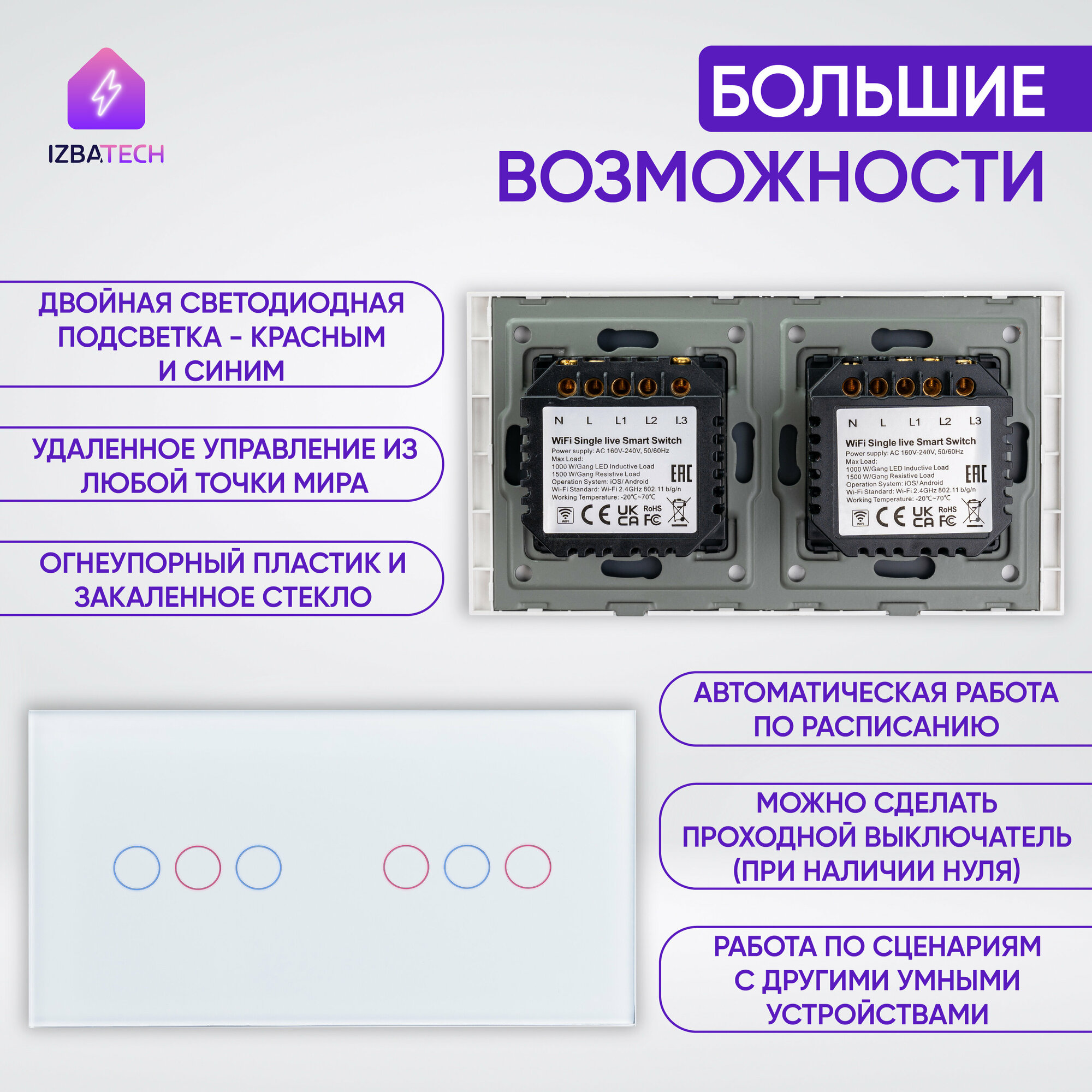 Умный выключатель Wi-Fi сенсорный на 2 поста (3 кл + 3 кл), с нулем и без нуля в одной рамке, белый, умный дом: сравнение цен, характеристики, фото, актуальное наличие и цены.
