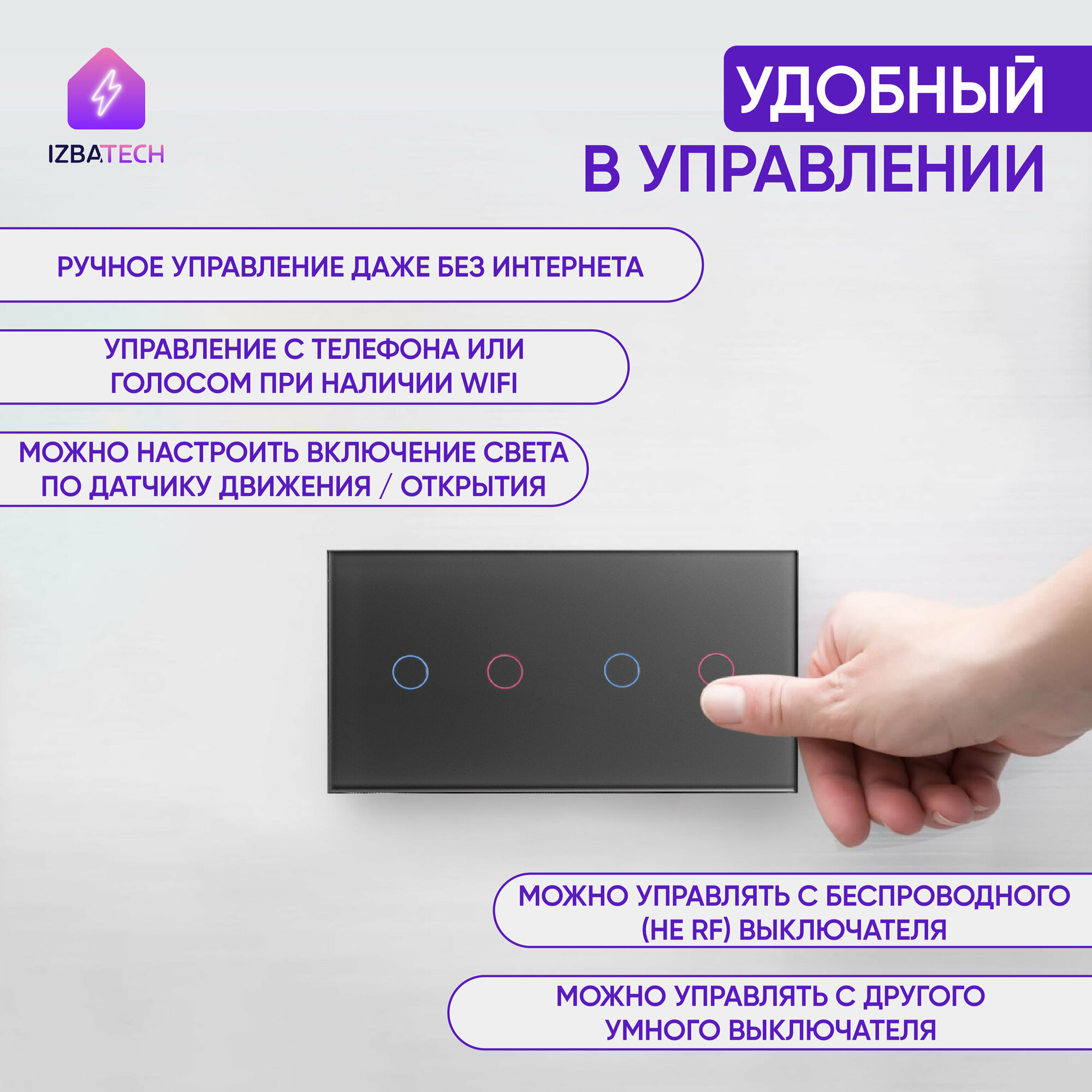 Представьте: одним касанием вы включаете основной свет, вторым — подсветку вдоль потолка, третьим — мягкое освещение вдоль пола, а четвертым - подсветку картин. И все это — в одной компактной панели, которая станет изюминкой вашего интерьера.