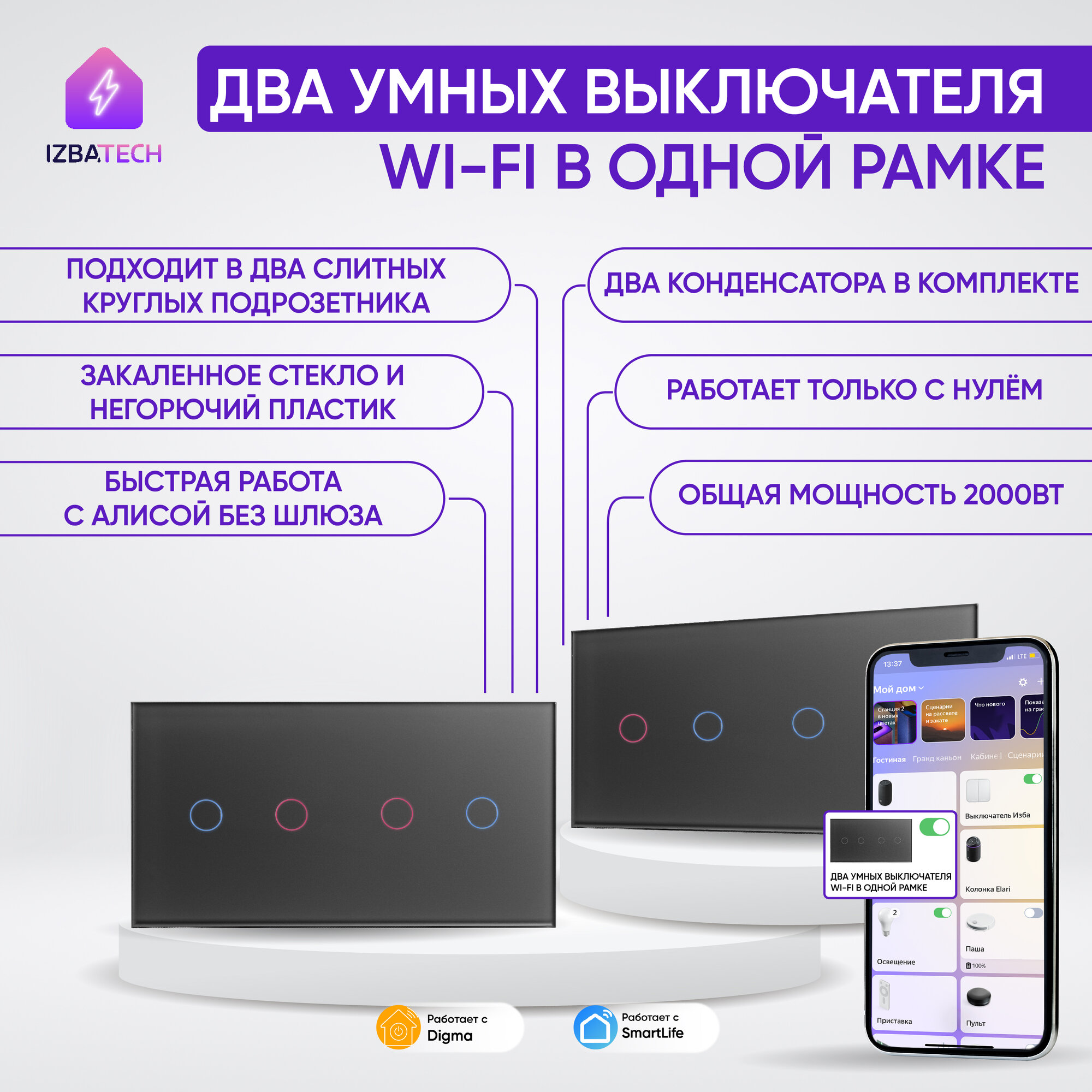 Только представьте — благодаря умному выключателю Wi-Fi на 2 поста (2 кл + 2 кл), сенсорному, с нулем и без нуля в одной рамке вы сможете создать обстановку в доме, похожую на кадры из кино.