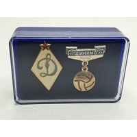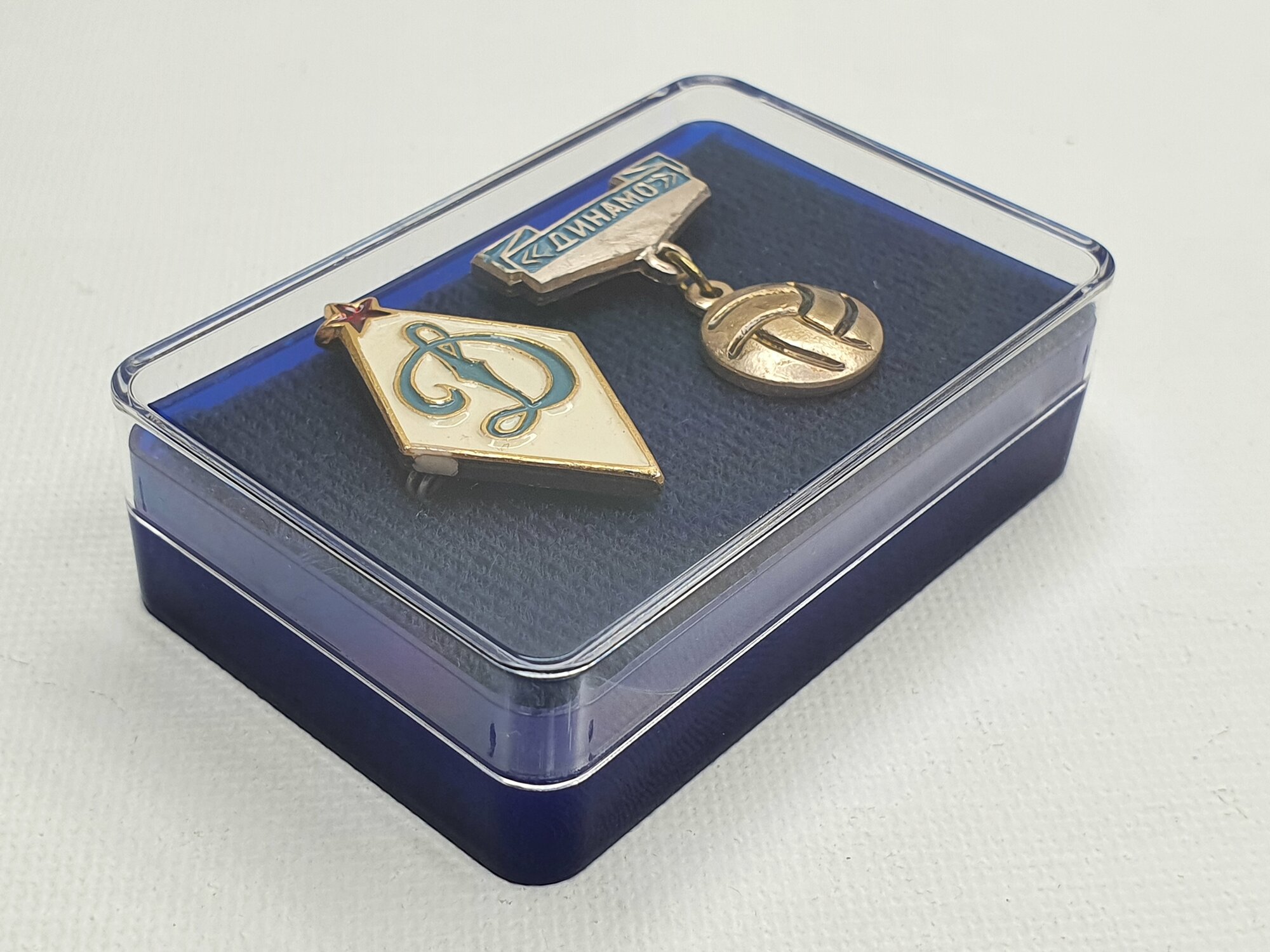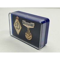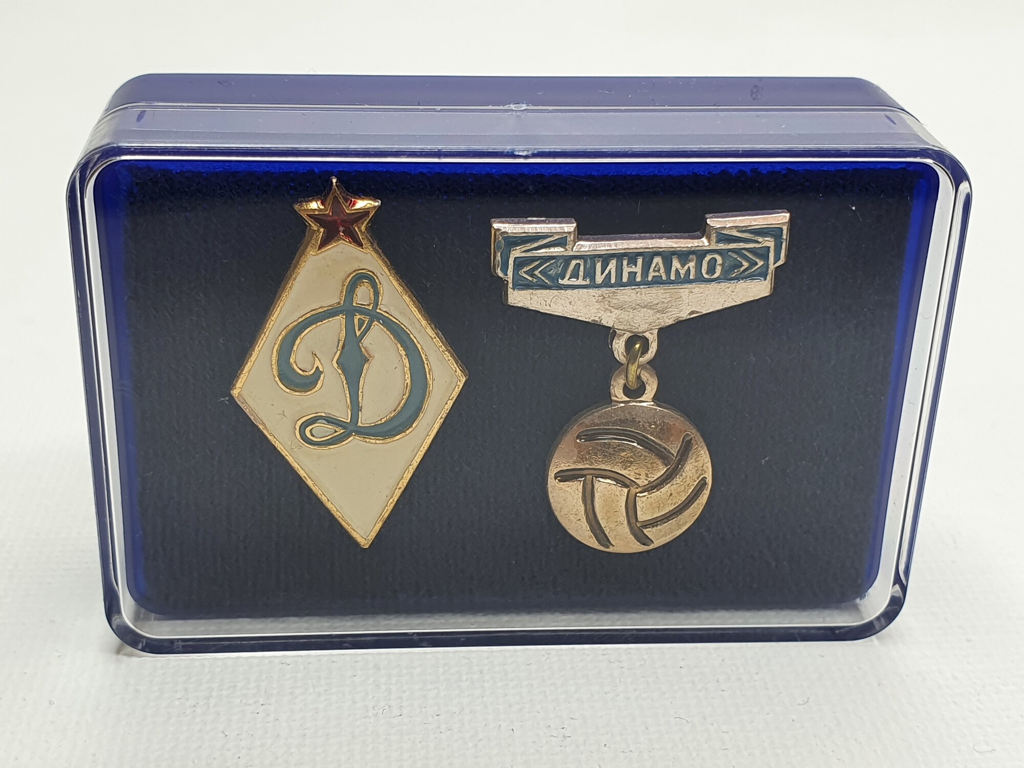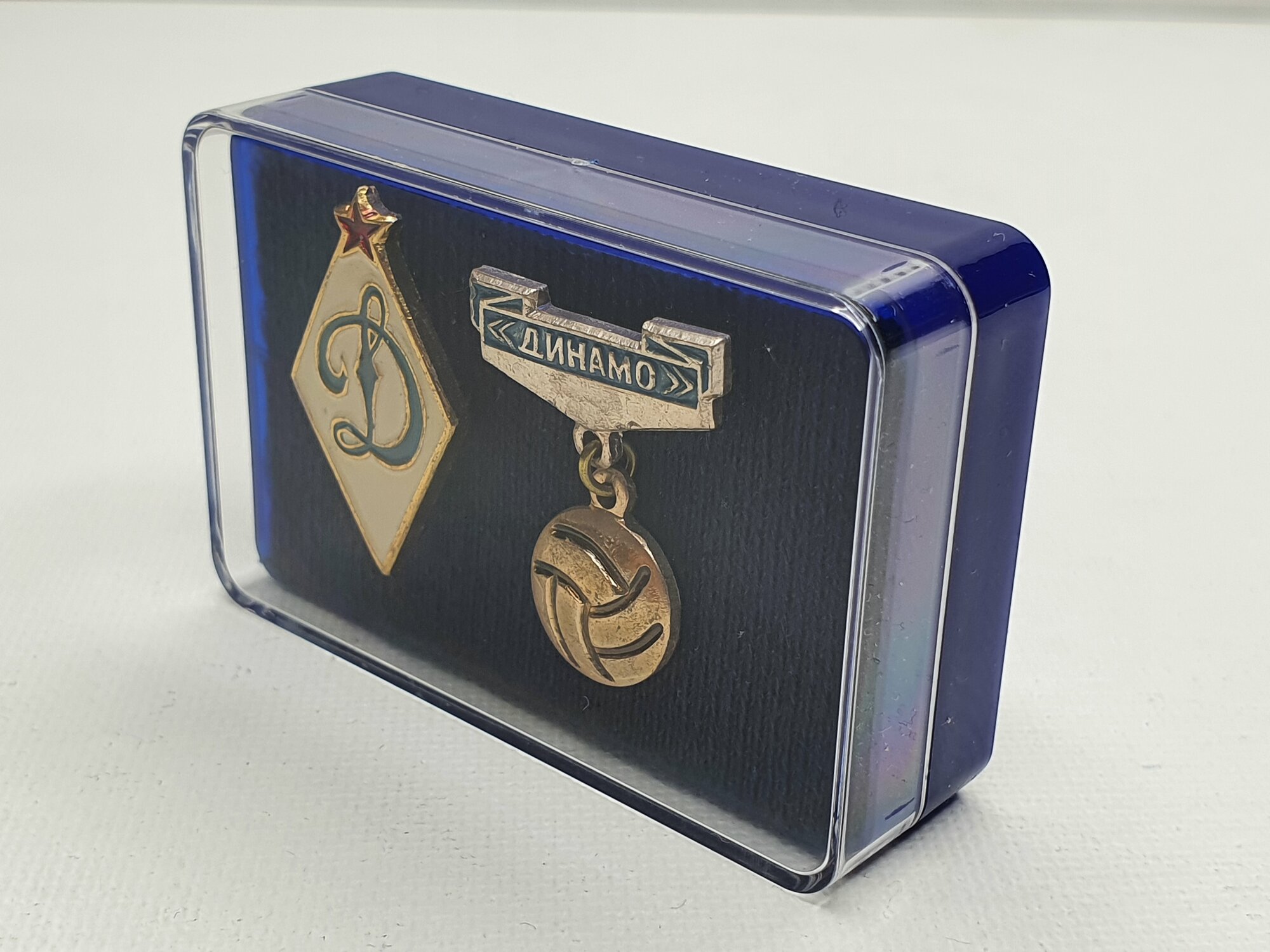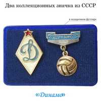 Два коллекционных значка ХХ века : Футбольная команда «Динамо» и эмблема спортивного общества «Динамо» в подарочном, пластмассовом футляре. Это значки периода СССР в хорошем, коллекционном состоянии. Значки выпускались ограниченный период времени и имеют свою коллекционную степень редкости. Отличный подарок, как для болельщика команды «Динамо», так и для коллекционера