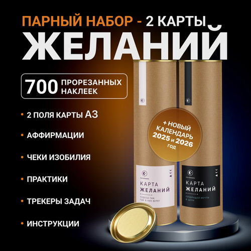 Парный набор для Карты Желаний, рассчитан на 2 человек. В комплекте - 2 сетки Багуа, 700 картинок-наклеек на двоих, среди которых есть изображения и аффирмации как для мужчин, так и для женщин. Карты выполнены в черном и лиловом дизайнах. Прекрасный подарок на любой повод! Карта Желаний - это самый мощный инструмент визуализации и исполнения желаний. Визуальное, материальное отображение наших желаний. Готовый набор поможет вам сэкономить время на подбор картинок, аффирмаций и других материалов для создания карты и их печать в типографии. Все необходимое уже в наборе! И даже больше, мы подготовили для вас приятные бонусы и дополнительные практики. Вам останется лишь загадать желания, и по инструкции создать свою идеальную карту желаний. Данный набор - это прекрасный подарок, который запомнится и принесет массу положительных эмоций. Если вы искали: подарок жене, мужу, подарок девушке, парню, подарок подруге, другу, красивая подарочная упаковка, карта желаний, заявление вселенной, чековая книжка изобилия, карта желаний, доска визуализации , набор для карты желаний, метафорические карты, доска желаний, карта желаний набор, визуализация желаний, сектора карты желаний, картинки для карты желаний, плакат для карты желаний, список желаний, подарок на день рождения, книги для женщин и мужчин, психология, доска для карты желаний, личностный рост, саморазвитие, рукоделие и творчество, досуг, хобби, набор для творчества, подарочный набор.