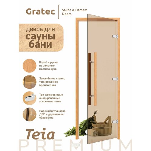 Купить Дверь для бани и сауны Gratec Teia Premium 2025, короб из массива бука, закаленное стекло 8 мм бронза, правое открывание с доставкой по всей России.