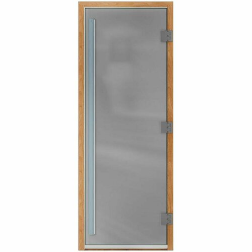 Коробка: Ольха с магнитным уплотнителем Размер 2100 х 800 указан по коробке Полотно: закаленное стекло (8мм), цвет "Сатин" (не прозрачная) Ручка вертикальная: Аллюминий (снаружи) / Термодревесина (внутри) Петли: 3 усиленных квадратных из алюминия с накладками из нержавеющей стали