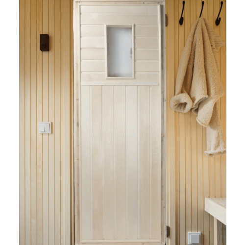 Дверь предназначена в парильных и моечных помещениях, таких как бани, сауны, а также ее можно использовать как входную или межкомнатную дверь, например, для дачного домика. Полотно двери изготовлено из осиновой вагонки, коробка - брус хвойных пород, вставка из прозрачного стекла 3 мм квадратной или прямоугольной формы.