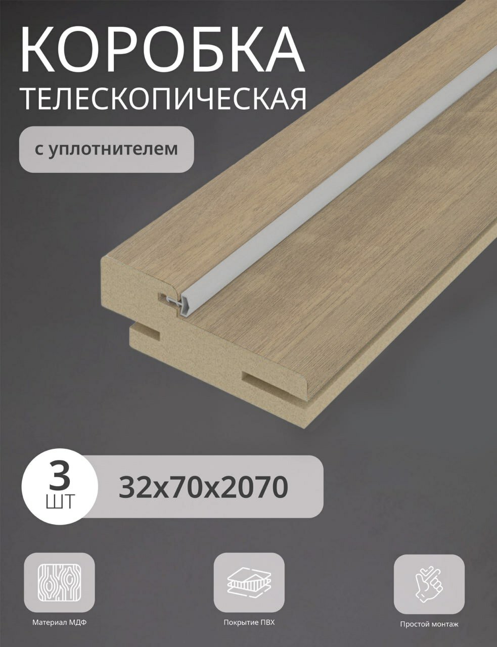 Дверная телескопическая коробка продается комплектом по 3 штуки, имеет размер 70х32х2070 мм и изготовлена из МДФ. Поверхность декорируется прочной текстурной пленкой с 3D-эффектом, устойчивой к истиранию, появлению царапин и трещин. Имеет уплотнитель для защиты от пыли и шума. Коробочный брус используется для создания промежуточной конструкции (коробки) - неподвижной части двери, к которой дверными петлями крепится дверная створка. Данная дверная коробка подходит для использования как в классических, так и в современных интерьерах, благодаря своему простому и стильному дизайну. Универсальные размеры коробки подойдут для большинства стандартных дверных проемов, делая ее установку простой и удобной.