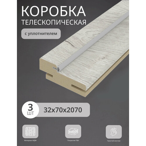 Дверная телескопическая коробка продается комплектом по 3 штуки, имеет размер 70х32х2070 мм и изготовлена из МДФ. Поверхность декорируется прочной текстурной пленкой с 3D-эффектом, устойчивой к истиранию, появлению царапин и трещин. Имеет уплотнитель для защиты от пыли и шума. Коробочный брус используется для создания промежуточной конструкции (коробки) - неподвижной части двери, к которой дверными петлями крепится дверная створка. Данная дверная коробка подходит для использования как в классических, так и в современных интерьерах, благодаря своему простому и стильному дизайну. Универсальные размеры коробки подойдут для большинства стандартных дверных проемов, делая ее установку простой и удобной.