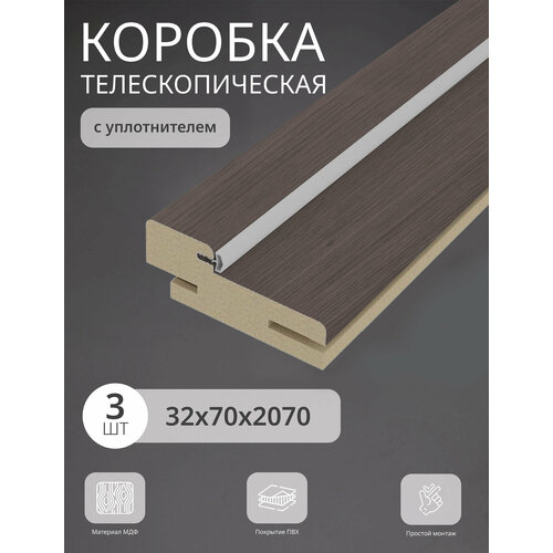 Дверная телескопическая коробка продается комплектом по 3 штуки, имеет размер 70х32х2070 мм и изготовлена из МДФ. Поверхность декорируется прочной текстурной пленкой с 3D-эффектом, устойчивой к истиранию, появлению царапин и трещин. Имеет уплотнитель для защиты от пыли и шума. Коробочный брус используется для создания промежуточной конструкции (коробки) - неподвижной части двери, к которой дверными петлями крепится дверная створка. Данная дверная коробка подходит для использования как в классических, так и в современных интерьерах, благодаря своему простому и стильному дизайну. Универсальные размеры коробки подойдут для большинства стандартных дверных проемов, делая ее установку простой и удобной.