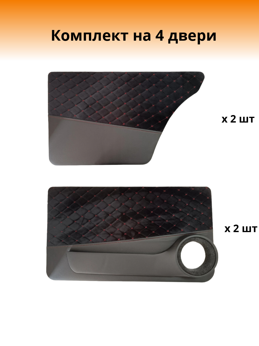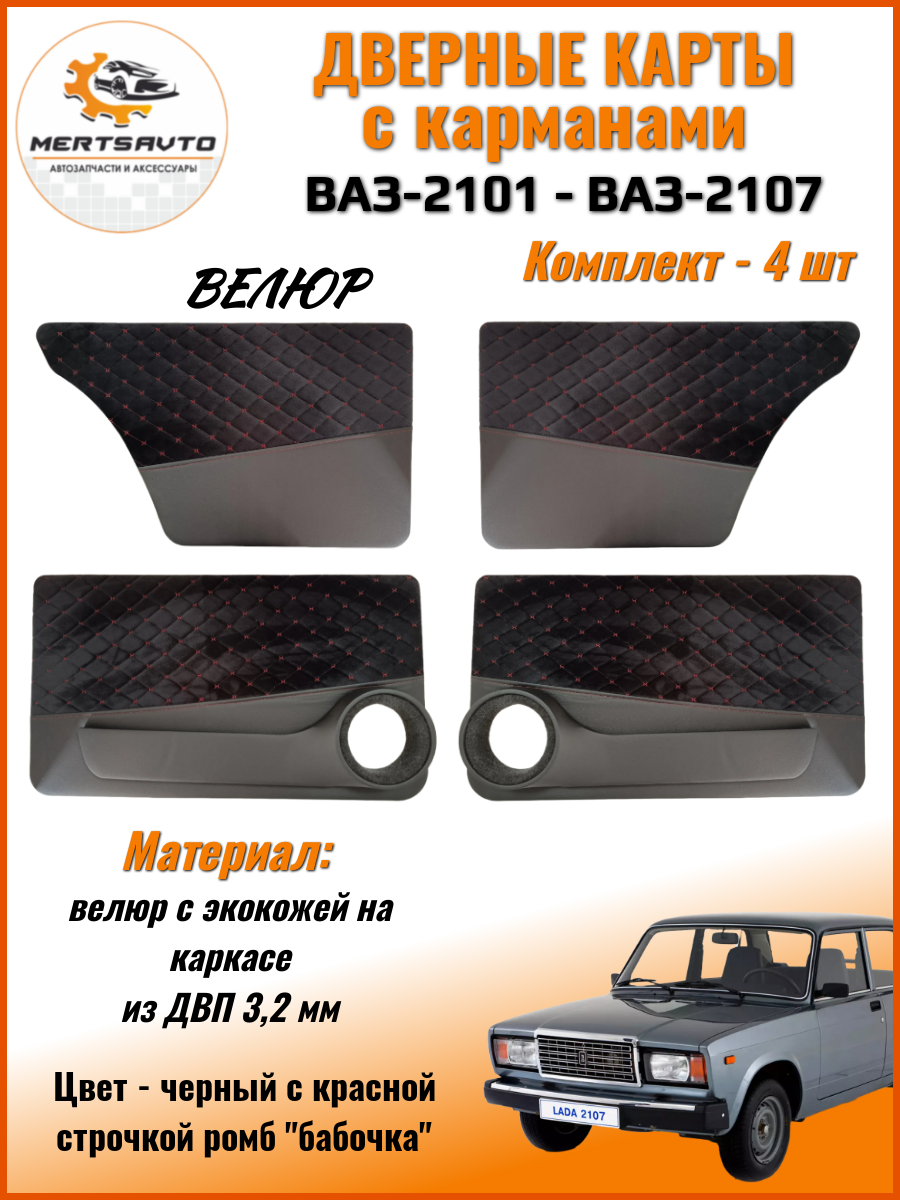 Дверные карты Mertsavto на ВАЗ2101-2107 с подиумом, черный с красной строчкой «ромб-бабочка» велюр на каркасе из ДВП: сравнение цен, характеристики, фото, актуальное наличие и цены.