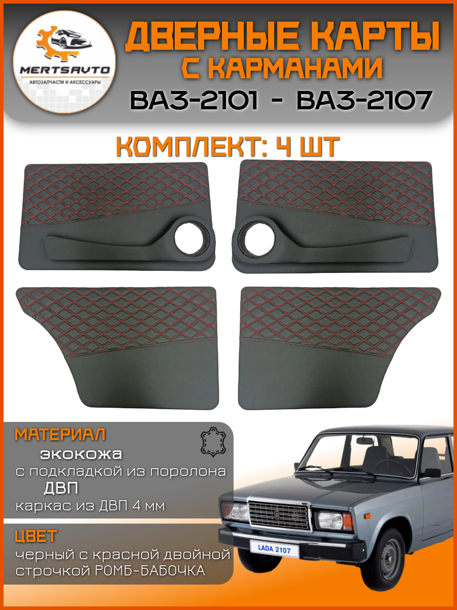 Дверные карты «классика» на ВАЗ-2101-2107 с подиумом, черный с красной двойной строчкой «ромб-бабочка»: сравнение цен, характеристики, фото, актуальное наличие и цены.