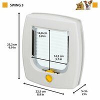 Модели Swing 1 и 3 с проёмом 14,5 x 14,8 см для кошек и мелких собак межкомнатные (не имеют системы против сквозняков). Обе опционально позволяют докупить дополнительные туннели для установки в толстое основание (SWING EXTENSION). Тройка имеет больше режимов работы замка дверки;