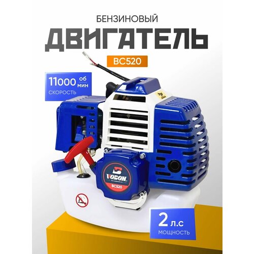 Двигатель 2-х тактный для бензокосы 1,7 л. с 52см3 (1500Вт) Двигатель 2 т одноцилиндровый с воздушным охлаждением, который специально разработанный для бензинового триммера. Посадочные отверстия для соединительной муфты имеют следующие размеры: по горизонтали и вертикали — 70 мм, по диагонали — 102 мм, диаметр сцепления - 76 мм. Благодаря своей мощности и эффективности, двигатель для триммера VOBON BC520 подходит для всех типов триммеров мощностью от 33 см³. Одно из главных преимуществ двигателя VOBON BC520 — его универсальность. Он может быть установлен на различное оборудование (бензиновые буры, мотобуры и лодочный мотор, триммер).
