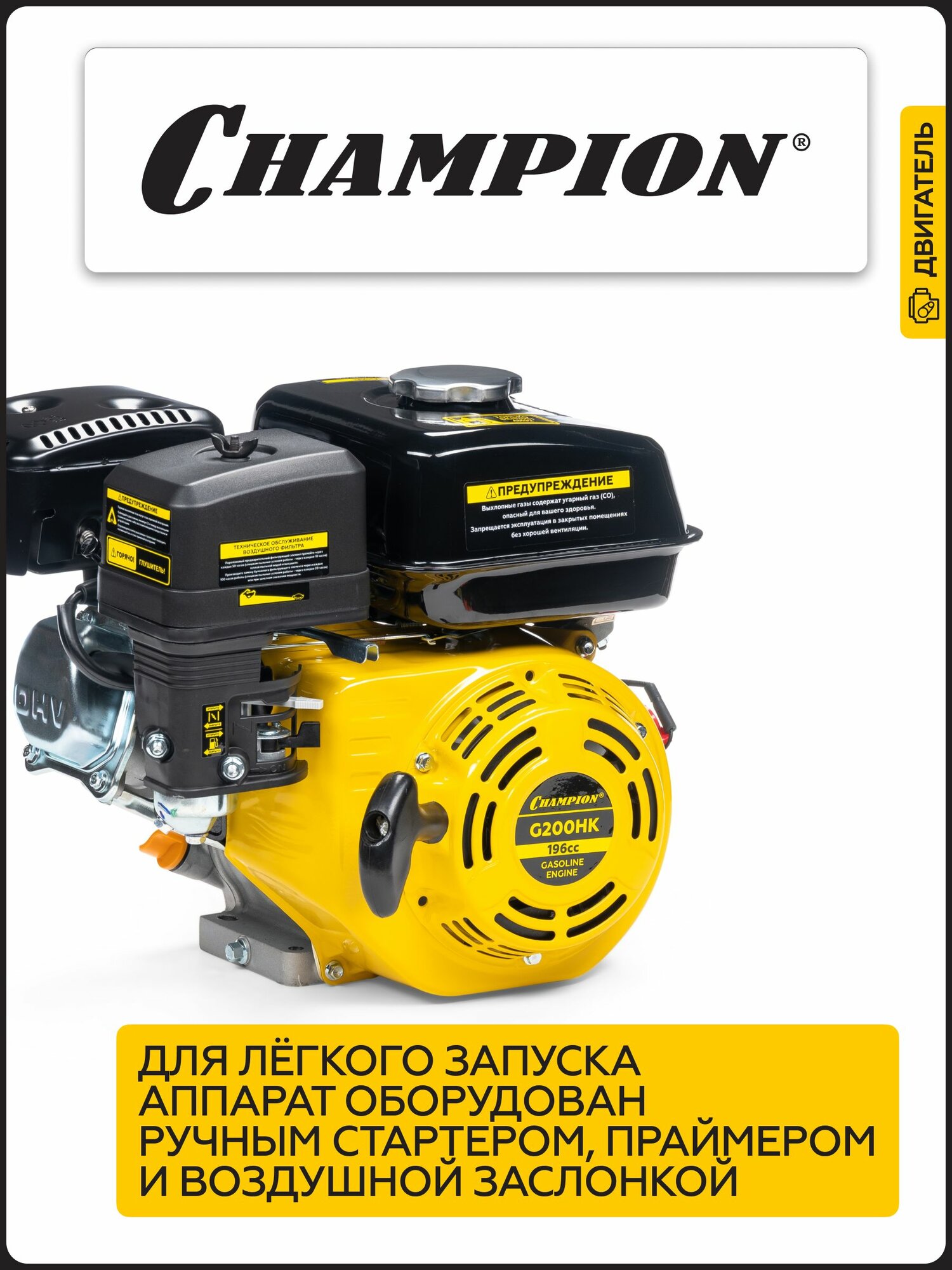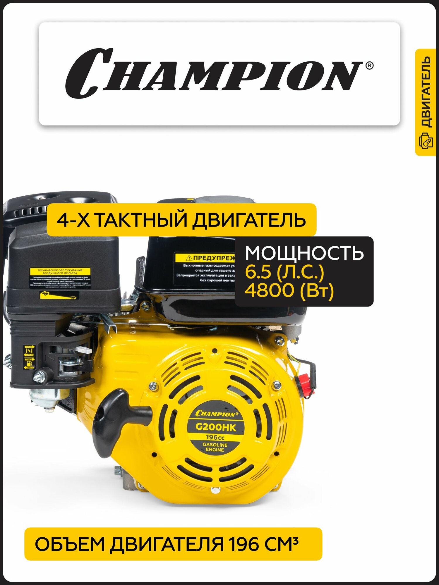 Двигатель бензиновый четырехтактный для мотоблока, газонокосилки CHAMPION G200-1HK, 4,8 кВт, 196 см3, ручной запуск: сравнение цен, характеристики, фото, актуальное наличие и цены.