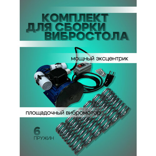 Комплект для сборки вибростола для производства тротуарной плитки, брусчатки, блоков, малых архитектурных форм. Комплектация: пружины - 6 шт, конденсаторы - 2 шт, эксцентрик, кнопка запуска, вилка, кабель 2 м. Двигатель однофазный 220В, 3000 оборотов в минуту (Россия), пружины толщиной 5 мм, выдерживают нагрузку до 200 кг. На последнем фото приведен пример монтажа.