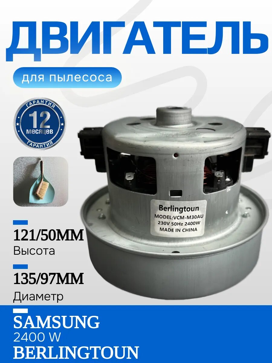 Двигатель для пылесоса Samsung 2400W - универсальный мотор для пылесосов. Движок samsung можно установить вместо 1600w и 1800w и 2200w, посадочные размеры: диаметр 135/97 мм, высота 121/50 мм. Замена турбины для пылесоса не потребует от вас больших усилий, его компактный размер и форма помогут Вам легко и самостоятельно его поставить. Запчасть совместима со многими моделями, например vcm-k40hu, vcm-m10gu Мотор является универсальным.
