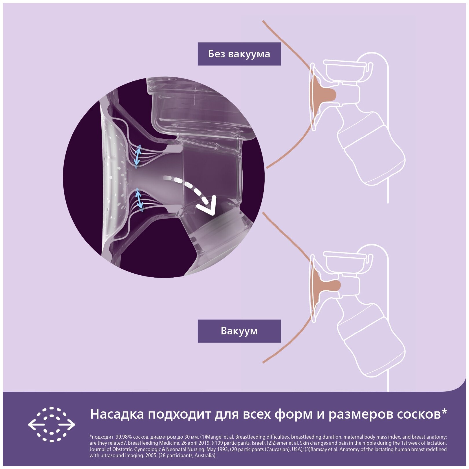 Подходит для всех форм и размеров сосков - один размер насадки для всех. У каждой женщины своя форма и размер сосков, и силиконовая насадка бережно адаптируется под вас. Подходит для 99,98 % сосков (до 30 мм).²