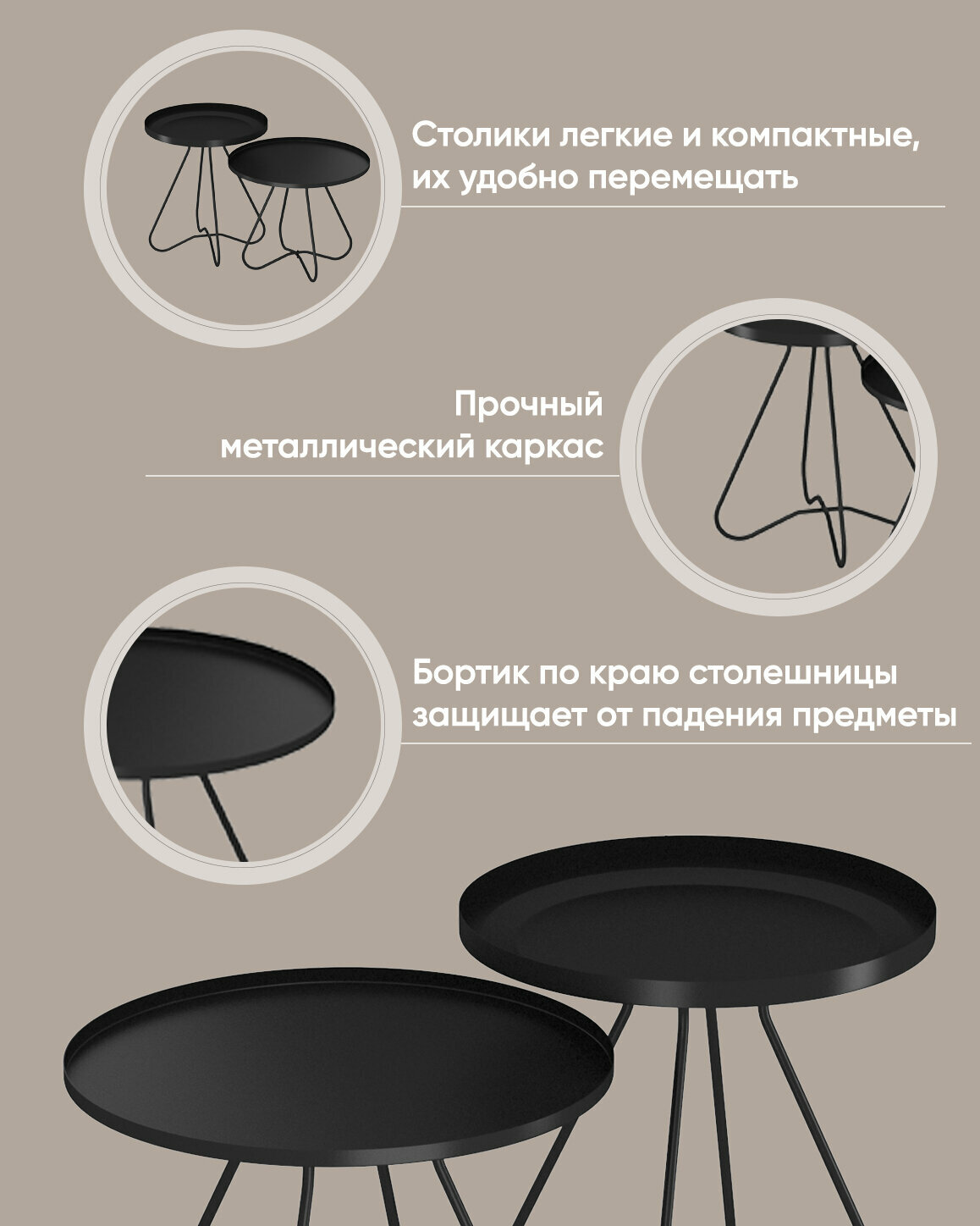 мобильный Столики легкие и компактные, их удобно перемещать. Вес каждого не более 1,5 кг. Особенно вы оцените удобство такого комплекта летом, когда захотите устроиться на веранде или балконе в уютной атмосфере. При необходимости экономии пространства маленький столик удобно задвигается под большой. Такой набор столиков выглядит необычайно стильно и презентабельно.